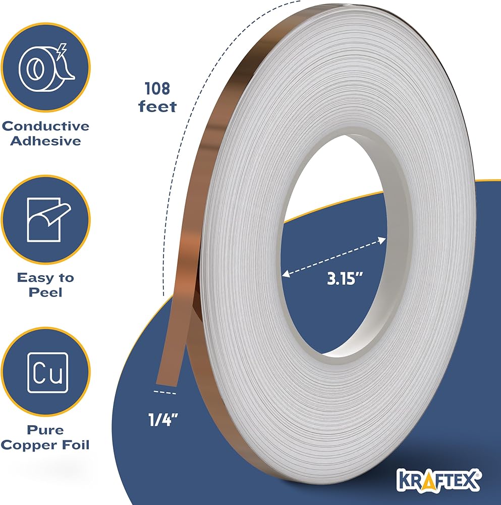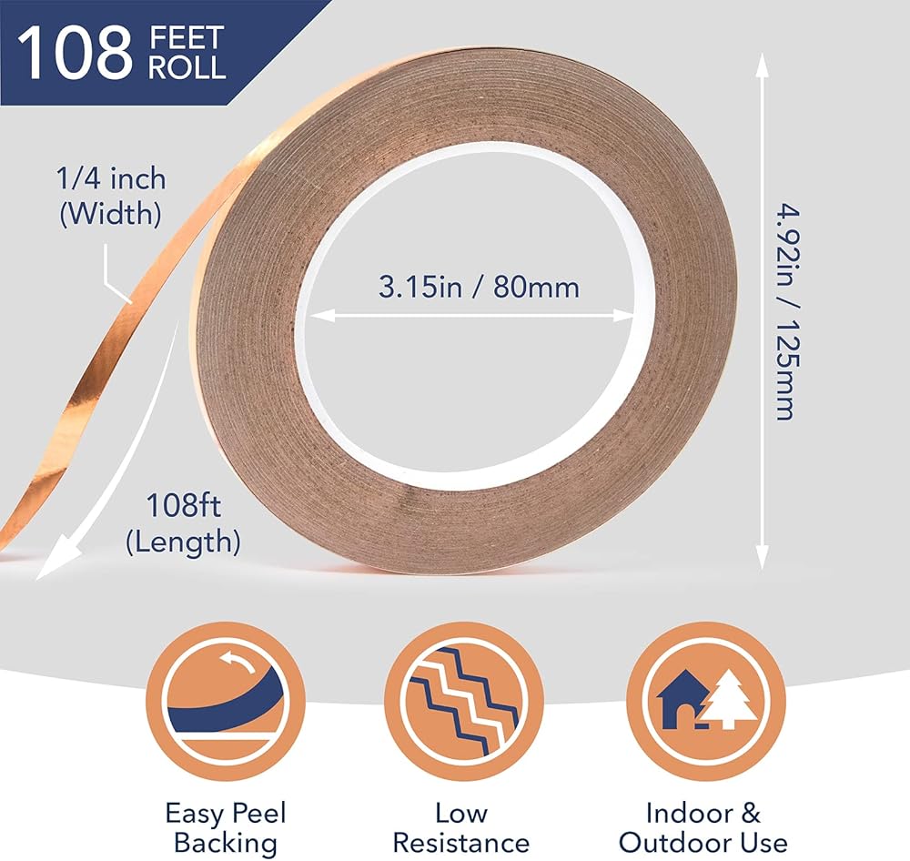 الدفاع EMI: يعد اللاصق الموصل بالشريط النحاسي الخاص بنا حلاً بسيطًا وفعالاً للحماية من EMI. يعد شريط الحماية النحاسي للجيتار مثاليًا لإزالة أي تداخل أو أصوات طنين من الأجهزة الكهربائية.