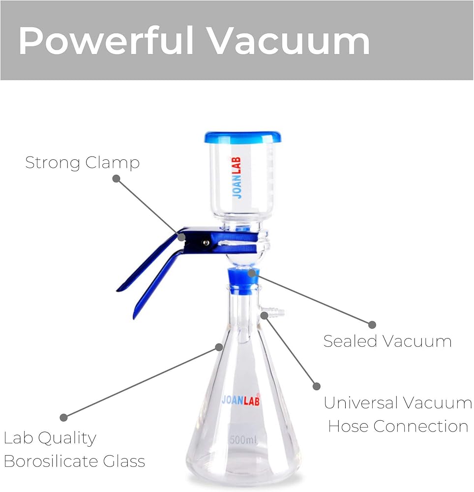 عملية ترشيح سريعة: يمكن استخدام مجموعة الترشيح والتقطير مع أو بدون مكنسة كهربائية؛ للحصول على مهام أسرع وأعلى حجمًا، ما عليك سوى ربط خرطوم المكنسة الكهربائية بقارورة الترشيح وسحب المحلول الخاص بك بسرعة عبر القمع؛ يسمح لك جهاز الترشيح الفراغي المعملي بتصفية المحاليل القابلة للذوبان في الزيت والماء دون إتلاف أو فقدان المركبات الحساسة للحرارة في عملية التقطير؛ تأتي دورق الترشيح هذا مزودًا بسدادة مطاطية عالية الجودة ومشبك ألومنيوم يسمح بمكانس كهربائية قوية