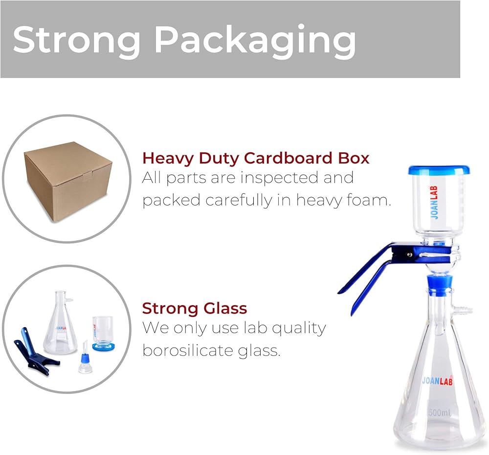 حلول نقية: يمكن استخدام قارورة مختبر الترشيح لفصل المكونات أو الشوائب في الخلائط أو المحاليل الخاصة بك؛ تم تصميم جهاز الترشيح ليدوم طويلاً باستخدام زجاج بوروسيليكات القوي والمقاوم للحرارة والمصمم للتعامل مع السوائل المغلية والمكانس الكهربائية القوية.