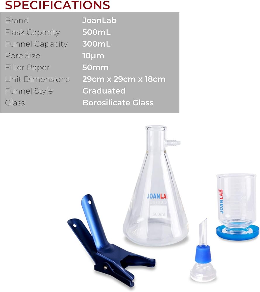 عملية ترشيح سريعة: يمكن استخدام مجموعة التصفية مع أو بدون مكنسة كهربائية؛ للحصول على مهام أسرع وأعلى حجمًا، ما عليك سوى ربط خرطوم المكنسة الكهربائية بقارورة الترشيح وسحب المحلول الخاص بك بسرعة عبر القمع؛ يسمح لك الترشيح الفراغي بتصفية المحاليل القابلة للذوبان في الزيت والماء دون إتلاف أو فقدان المركبات الحساسة للحرارة في التقطير؛ تأتي دورق الترشيح هذا مزودًا بسدادة مطاطية عالية الجودة ومشبك ألومنيوم يسمح بمكانس كهربائية قوية