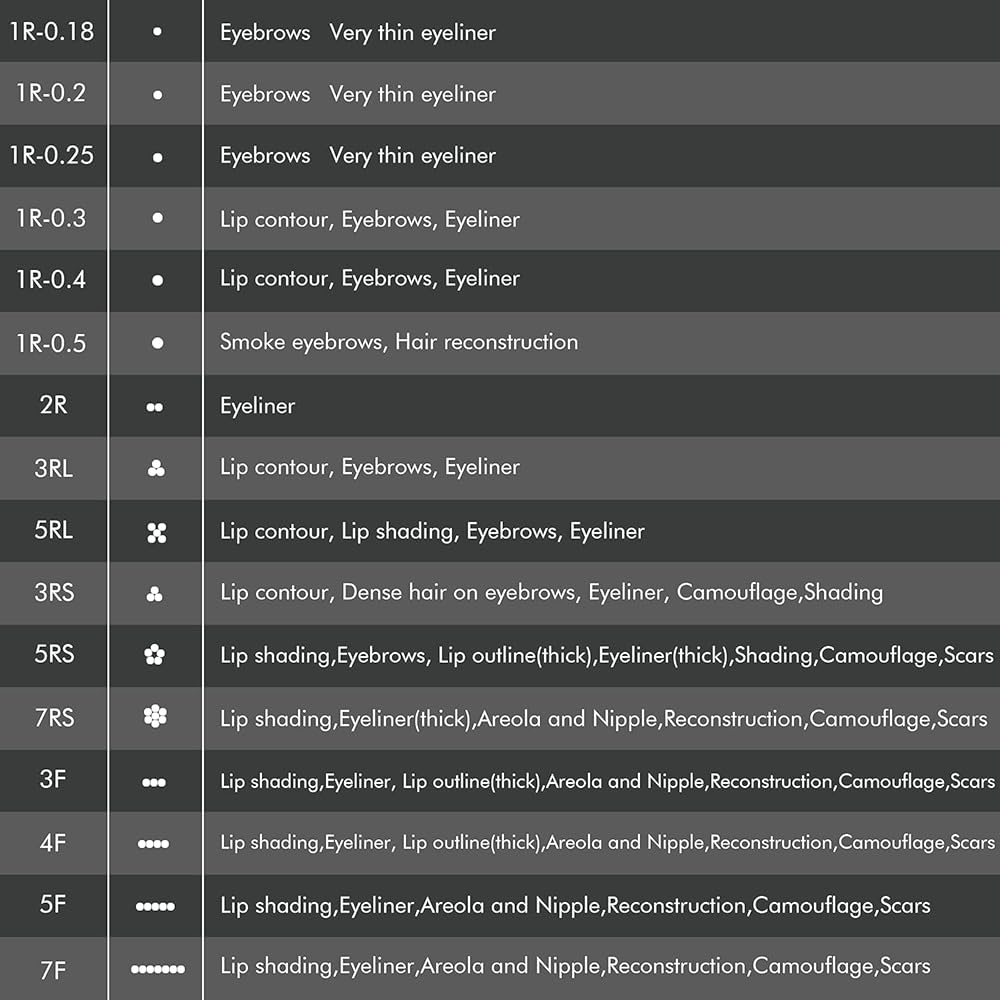 1R--0.25 مم: إبر خرطوشة النانو. مناسب للشعر الرقيق على الحاجب، وكحل رفيع.