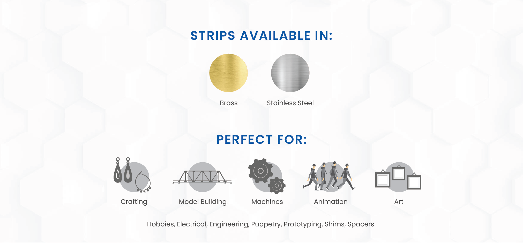"Our Materials, Your Creations" Most Common Uses: DIY Projects (Jewelry, Home Décor, Tinkering, ETC...), Model Making (Trains, Planes, R/C Cars, Etc...), Arts & Crafts, Home Improvement, Electrical, Woodworking, Engineering, Education, Puppetry/Stop-Motion Animation