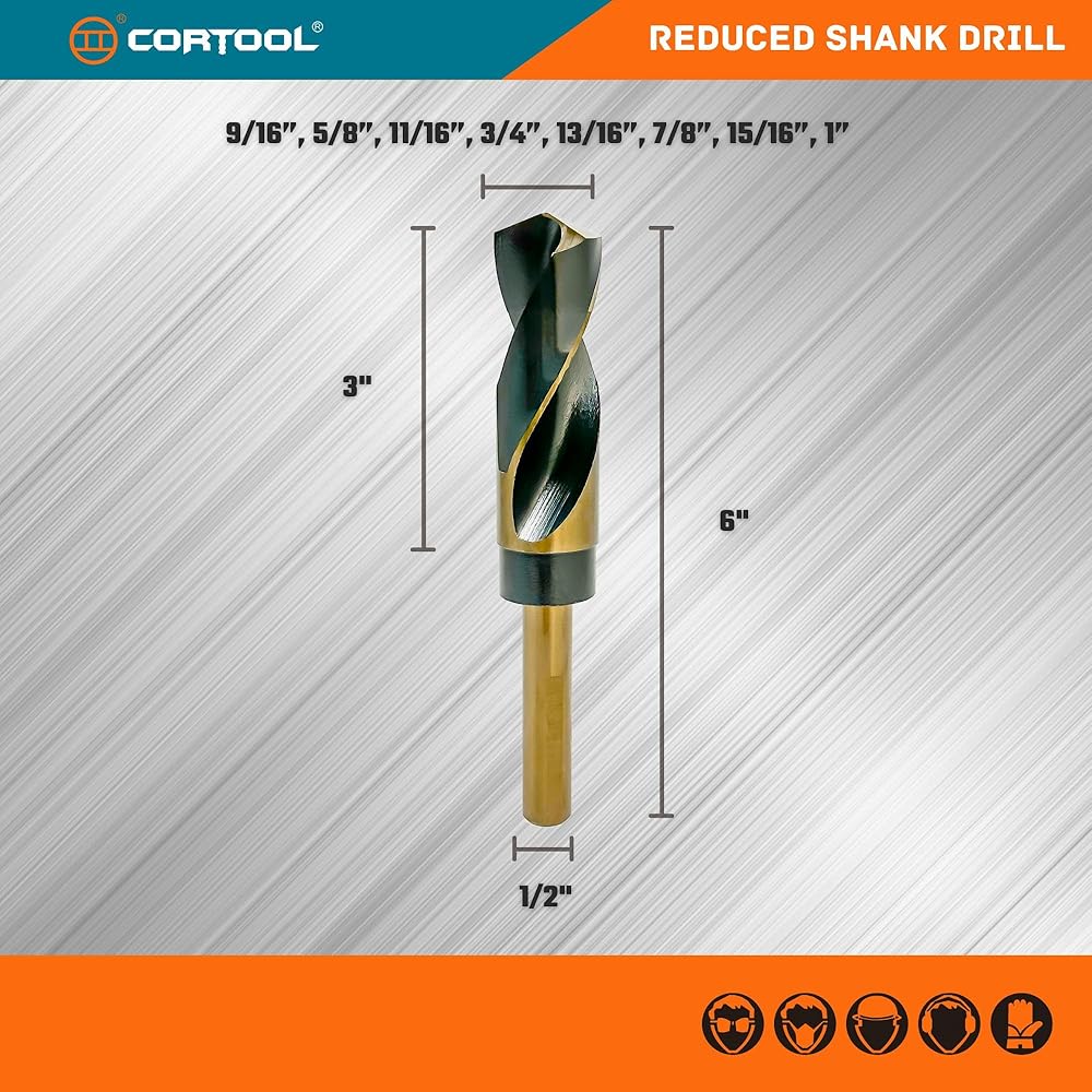 CORTOOL Drill Bits Set, Reduced Shank High Speed Steel Black & Gold Drill Bit with 1/2" Shank, HSS M2 Drill Bit for Metal and Steel, Silver and Deming Drill Bit - 8PCS Reduced Shank Drill Bit Set Product Description: Premium Material - Crafted from High Speed Steel (HSS) in a sleek Black and Gold finish, this drill bit set offers exceptional durability, sharpness, and performance, while effectively reducing friction and maintaining cooler operation. Advanced Coating - Featuring a dual coating of premium gold titanium and black nitride oxide, this set boasts superior lubrication properties for smoother drilling. Additionally, the coating enhances durability and corrosion resistance compared to standard black surfaces. Optimized Design - The drill bits are designed with a 135-degree split point, promoting increased cutting speed and accuracy by facilitating self-centering and preventing walking. This design also ensures efficient chip and particle removal, while the split point tip enhances wear resistance. The 135-degree angle allows for drilling through hard materials without the need for a pilot hole, producing smaller chips to minimize clogging. Comprehensive Set - This set includes 8 pieces of 6-inch long silver & deming drill bits, conveniently stored in a heavy-duty aluminum case for easy transport and organization. Sizes range from 9/16” to 1”, covering a wide range of drilling needs. Versatile Application - Suitable for drilling a variety of materials including steel, copper, aluminum, brass, hardwoods like oak and maple, engineered wood products like MDF and pine, as well as plastics such as PVC, polycarbonate, acrylic, ABS, nylon, and composite materials.