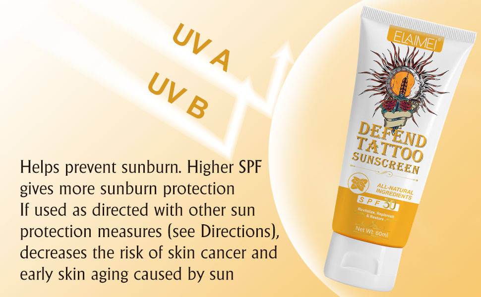 الفوائد - يساعد واقي الشمس للعناية بالوشم على حماية البشرة من الضغوطات البيئية الضارة مثل الأشعة فوق البنفسجية. كما أنها تساعد في عكس علامات التلف من خلال العمل على إعادة فحص حاجز الجلد المتضرر.