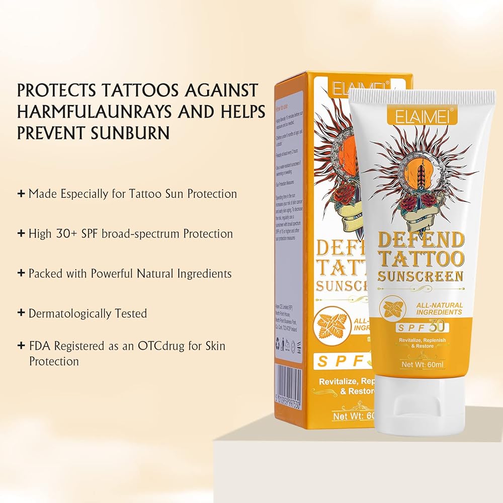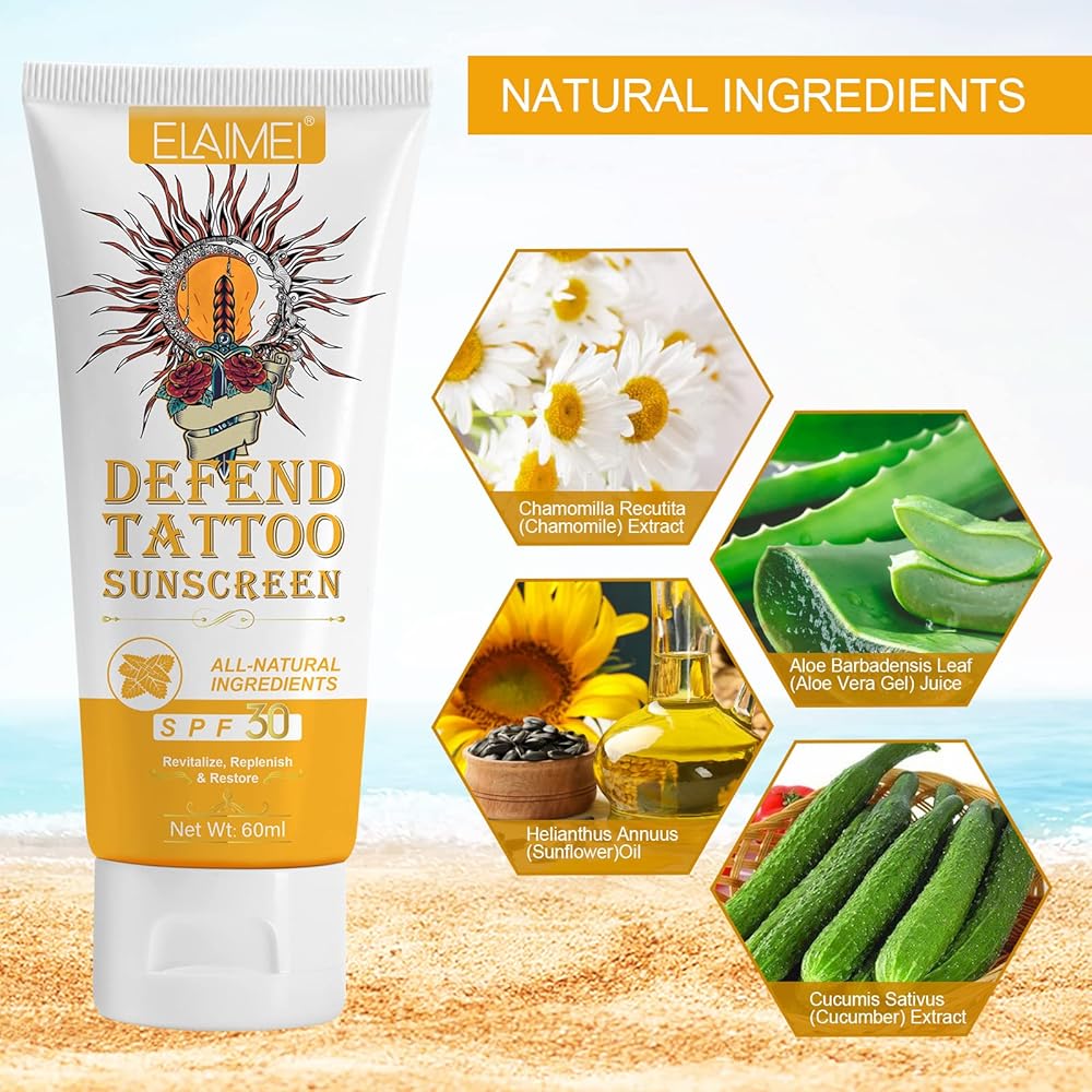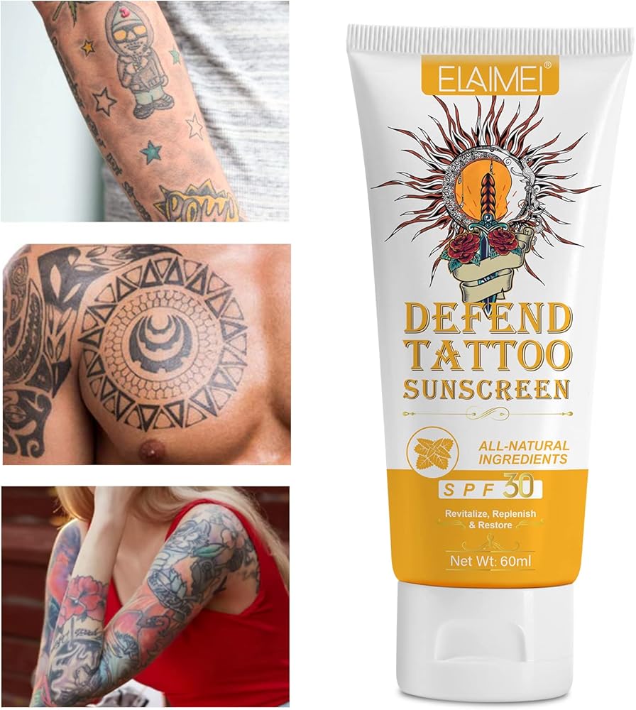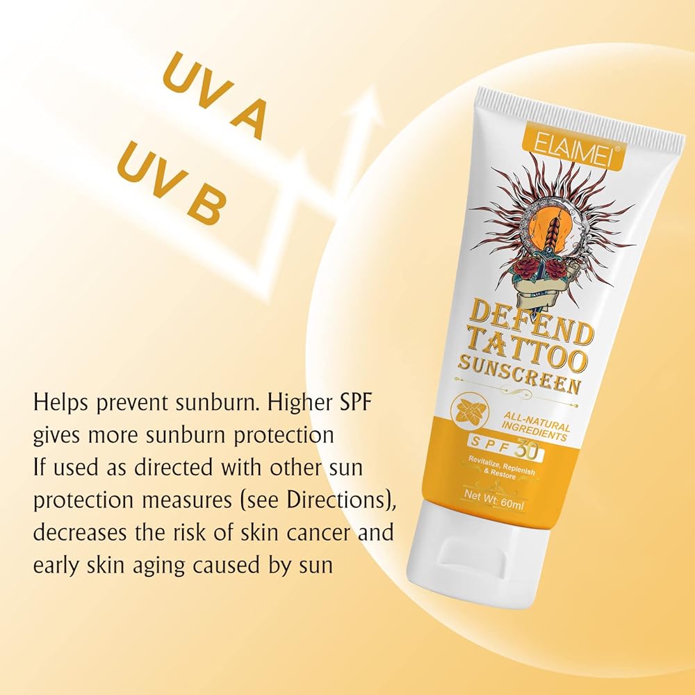 حماية من أشعة الشمس للوشم - مرهم واقي من الشمس بعامل حماية من الشمس 30+ مصنوع خصيصًا للبشرة المحبرة. عامل حماية من الشمس SPF 30 يحمي من الأشعة فوق البنفسجية فئة A وB الضارة. يرطب البشرة ويغذيها بعمق. يمنع ألوان الوشم من التلاشي والتشقق. مناسب لجميع أنواع البشرة.