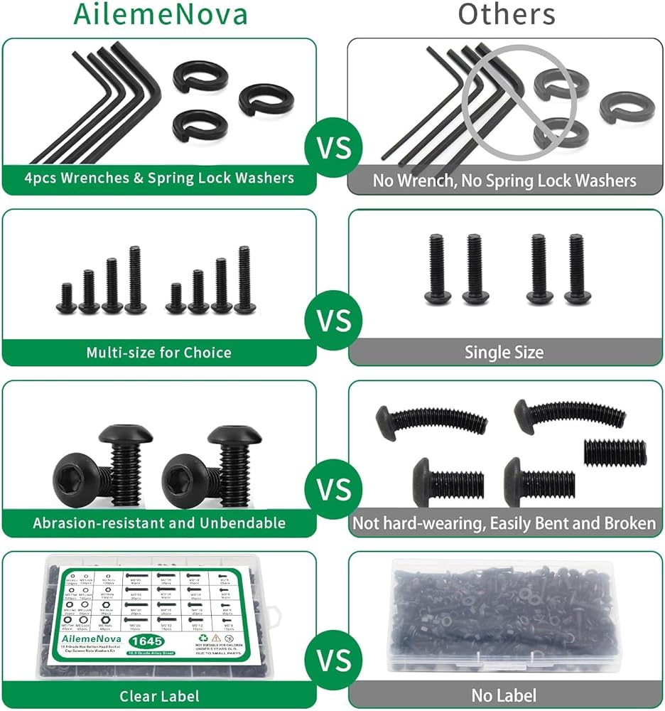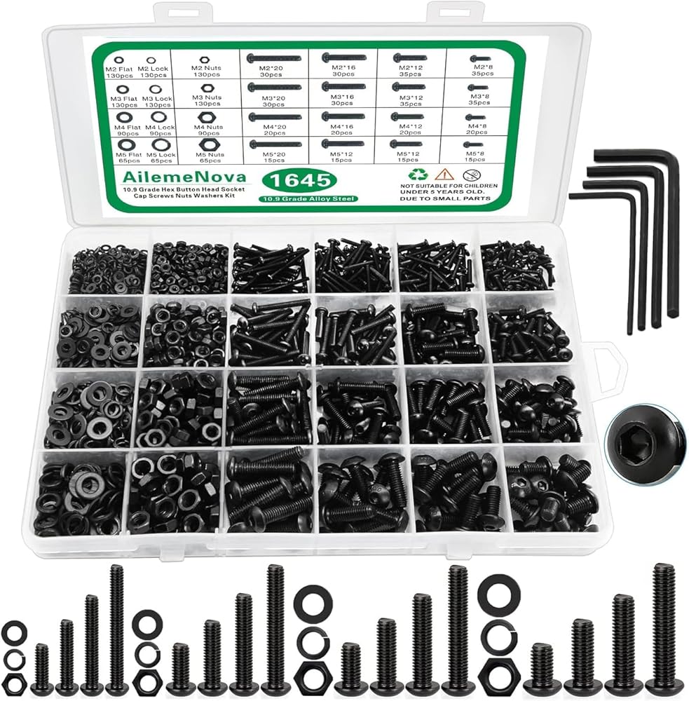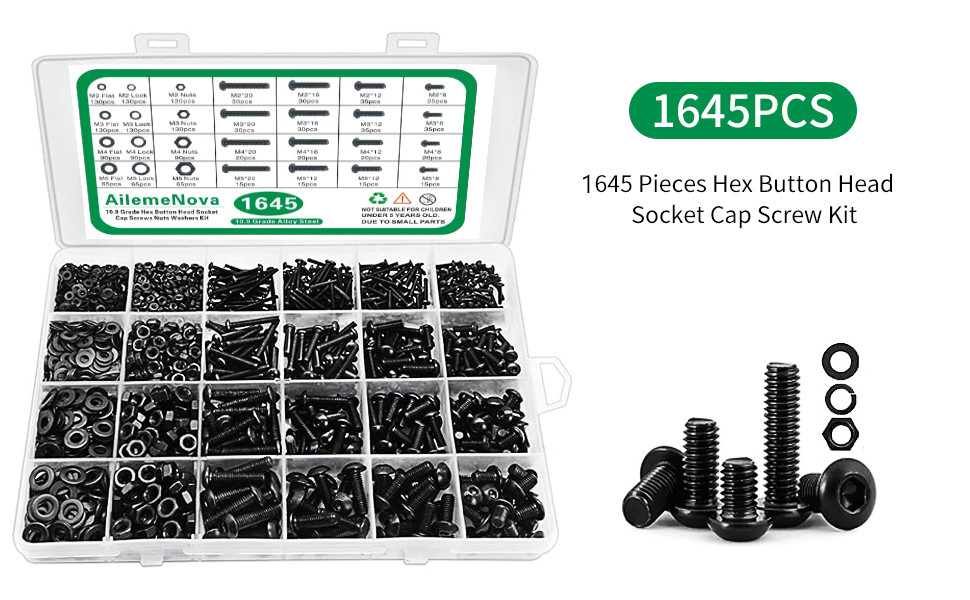 【حجم متري موحد】تحتوي البراغي والصواميل على 1645 قطعة بما في ذلك 4 من الأحجام الأكثر شيوعًا في الحياة: M2 M3 M4 M5. غسالات صواميل ومسامير ذات غطاء رأس مسطح سداسي. وفقا للنظام المتري الموحد. مجموعة البراغي مجهزة بصامولة وغسالة، ويأتي كل صندوق مع ثمانية مفاتيح ألين مجانية، لذلك تحتاج فقط إلى شراء مجموعة واحدة لتلبية احتياجاتك المتنوعة!