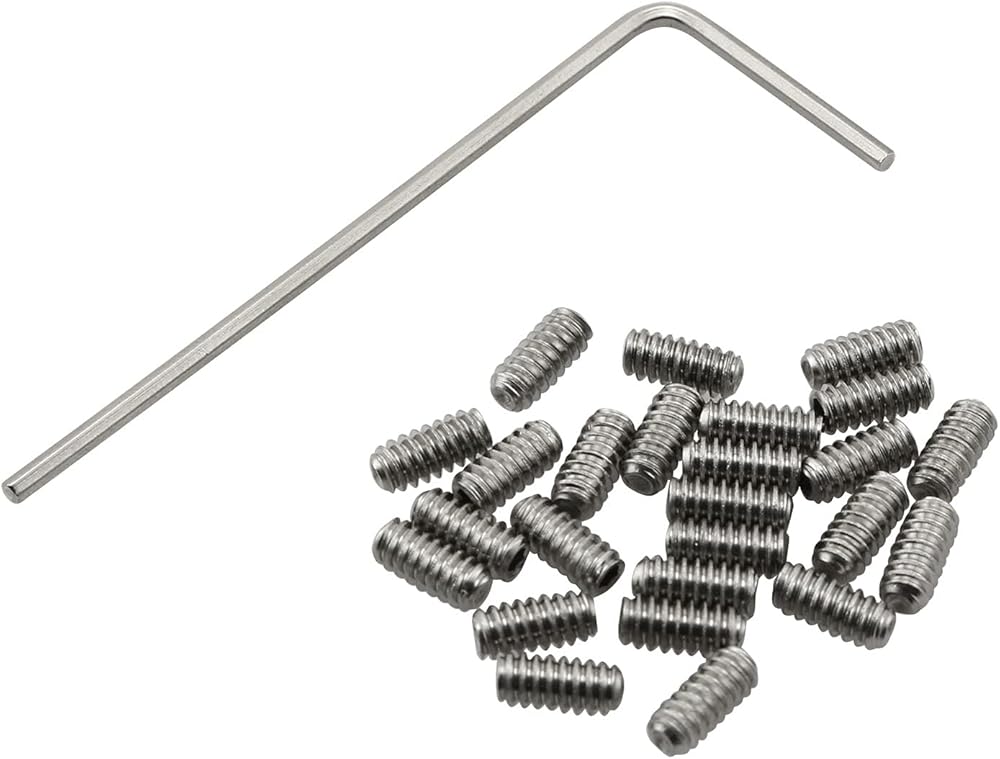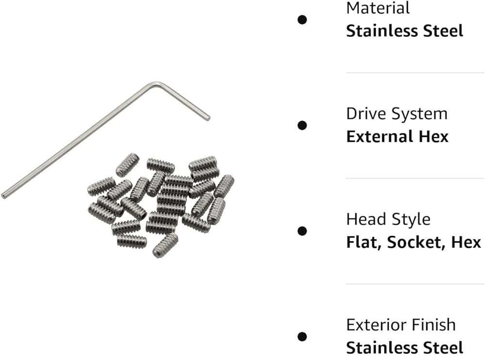 High-quality materials: The fixing screws and wrenches are made of stainless steel, which are not rusty, pollution-free and durable. Product function: The set screw passes through the threaded hole in the external object and is close to the internal object to prevent it from moving relative to the external object. It applies compression or clamping force through the bottom tip that protrudes from the hole. Package contains: 25 x fixing screw 1 x hex wrench