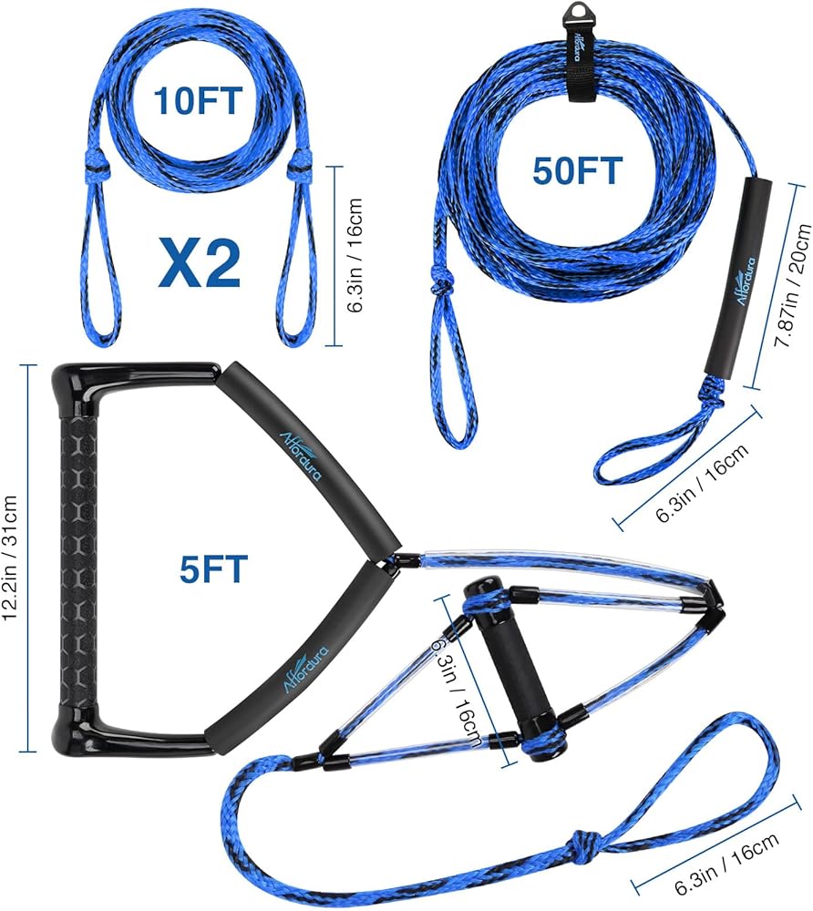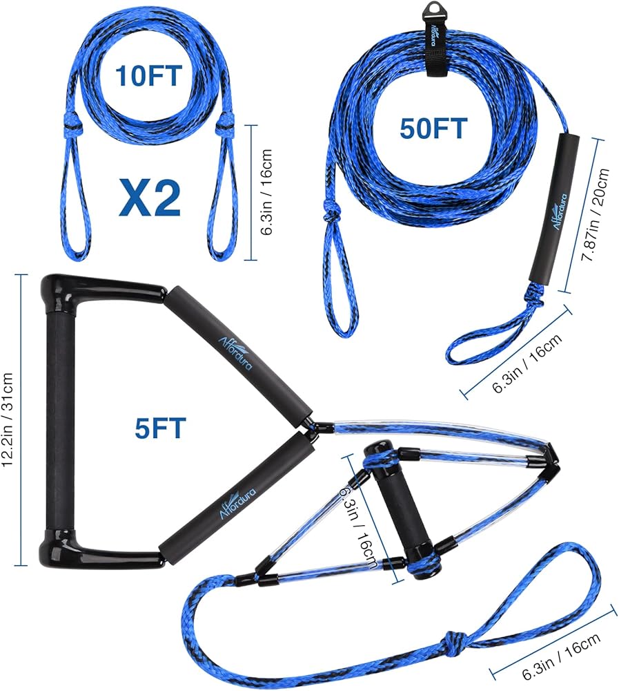 • طول قابل للتعديل - يبلغ طول حبل سحب التزلج 75 قدمًا مع 4 أقسام يمكنك إخراجها لضبط الطول. يمكنك اختيار وجود خط بطول 50 أو 60 قدمًا خلف القارب لسحب الأنبوب، فهو يتمتع بقوة شد تبلغ 1500 رطل، ويوصى بشدة باستخدام أنبوب لشخص واحد. أو يمكنك اختيار حبال التزلج بطول 55 أو 65 أو 75 قدمًا للتزلج على الماء.