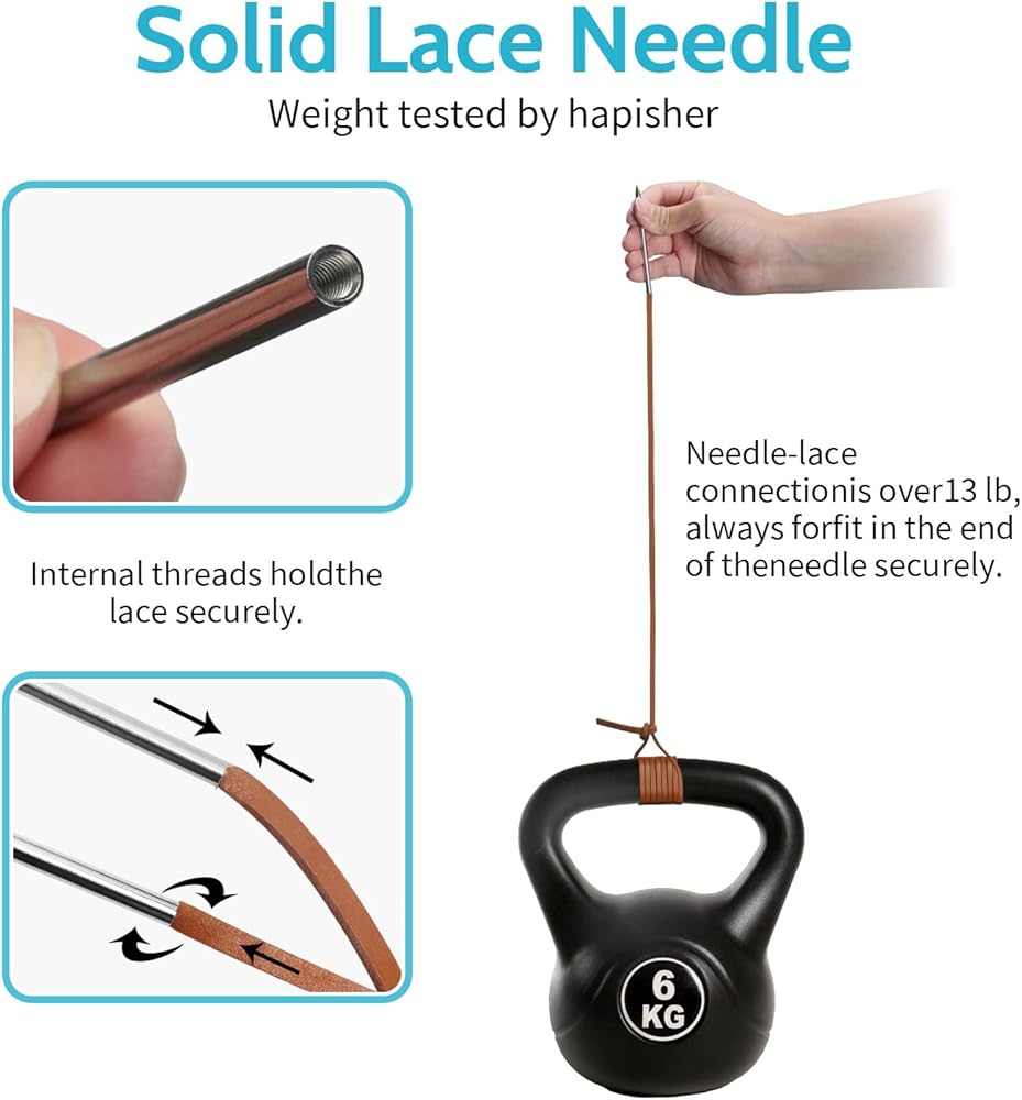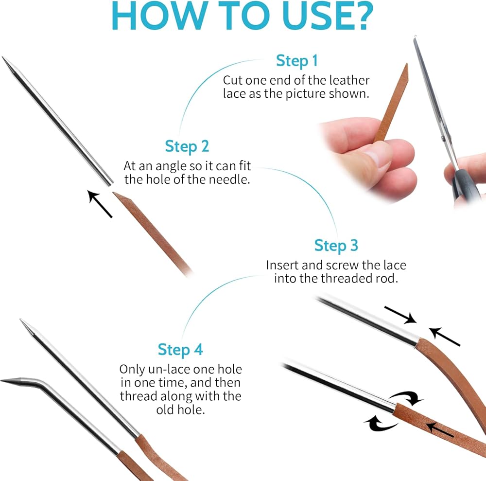 Constructed from high-quality stainless steel, our lacing needle is designed to withstand the rigors of regular use, offering unmatched durability and longevity. The thread-in-hole design ensures that your glove lace is securely fastened at the needle's end, allowing for smooth passage through glove eyelets without sliping or snagging.