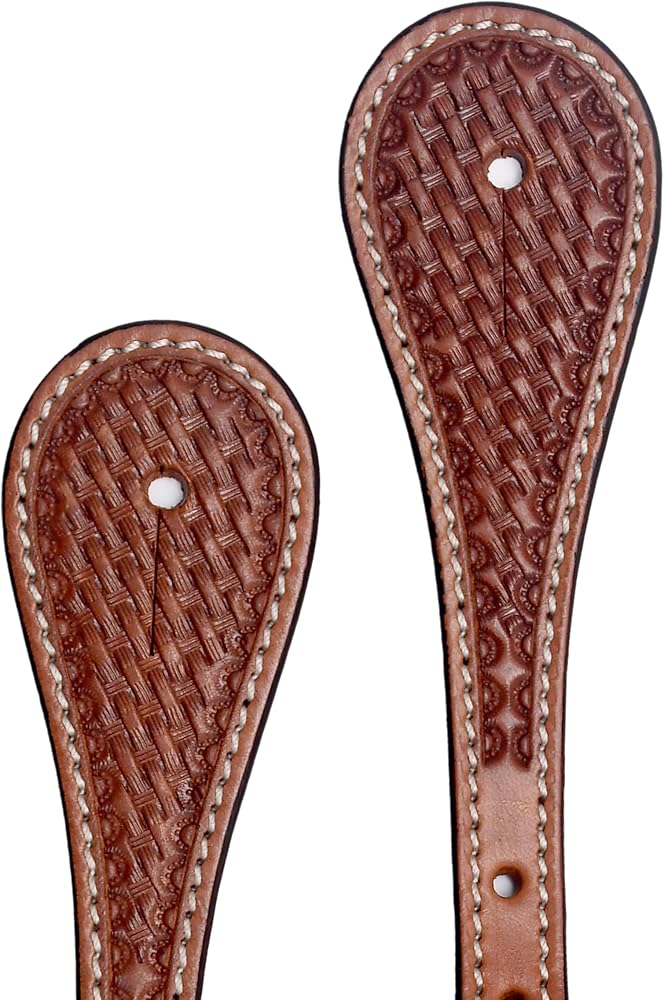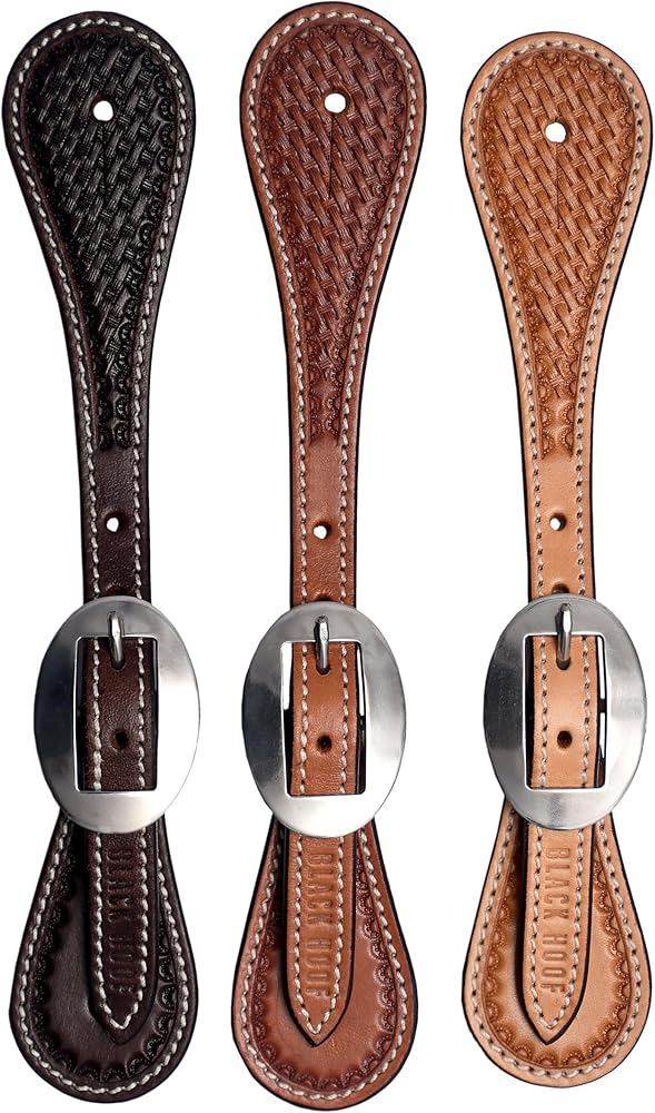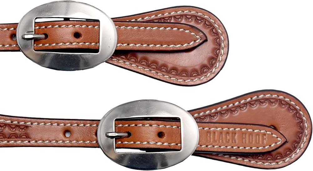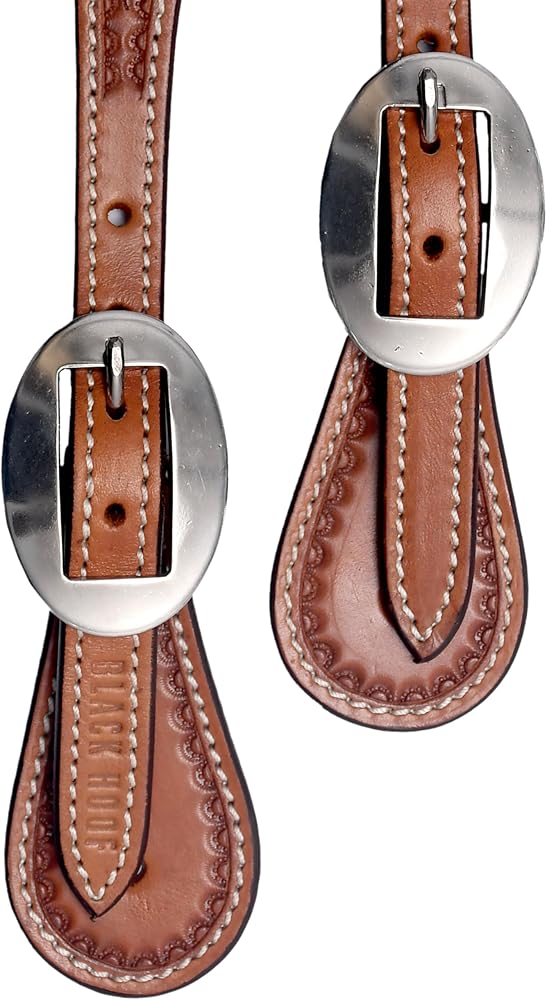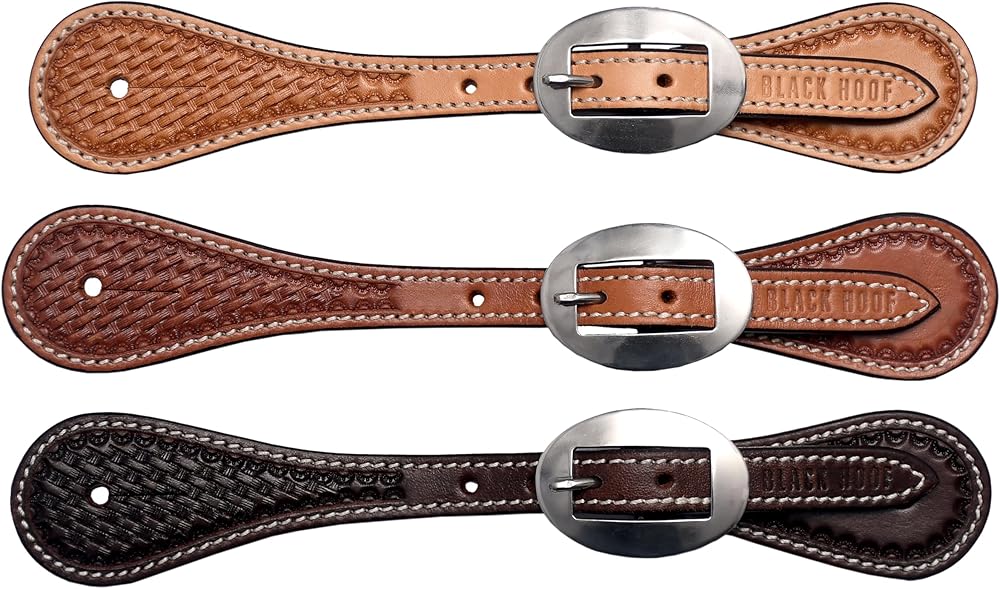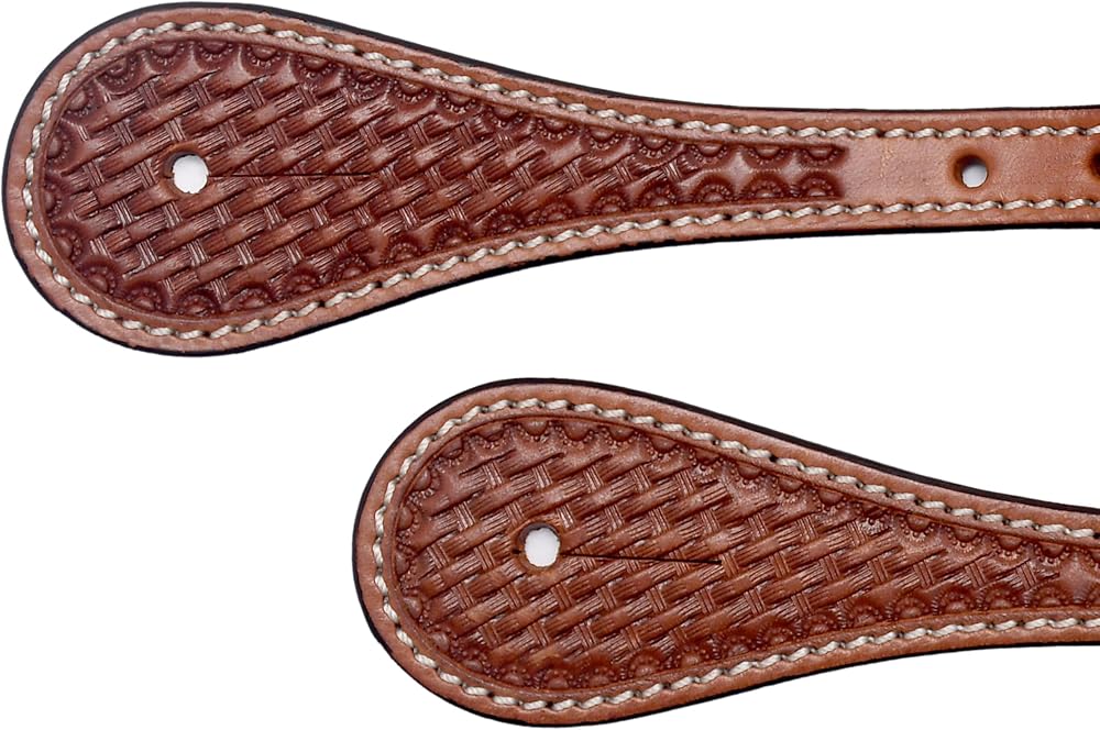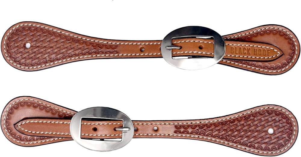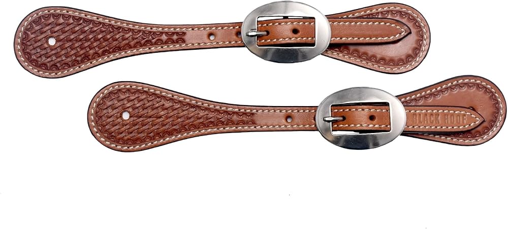 Great Basket Tooled spur straps made with high quality Skirting leather, light weight, stylish, not easy to break , 5 holes on the belt helps you adjust the buckle according to your comfort while riding. The Brass buckle with nickel plating adds unique look to it.