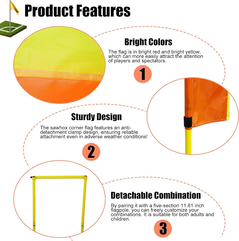 • ألوان زاهية - أعلام زوايا SAWHOX مصنوعة باستخدام مواد عالية الجودة بألوان زاهية ولافتة للنظر. أسطح العلم الساطعة مرئية للغاية من مسافة بعيدة، مما يضمن أن اللاعبين والمسؤولين والمتفرجين يمكنهم اكتشافهم والتعرف عليهم بسهولة في الملعب، مما يعزز السلامة وتدفق اللعبة.