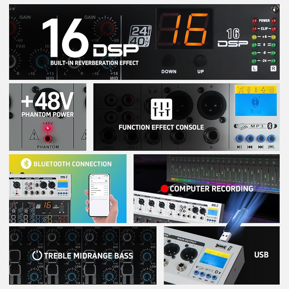 خلاطات تسجيل غير مدعومة مع 16DSP 24 بت مع وحدة تحكم MP3 USB DJ Bluetooth Audio Mixer Console بقوة 48 فولت، ولوحات خلط نطاقات 7 قنوات لتسجيل الاستوديو (N7)