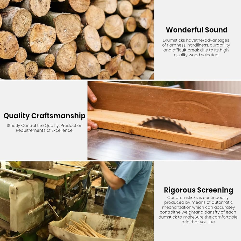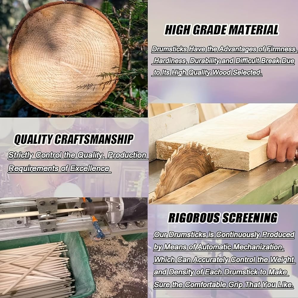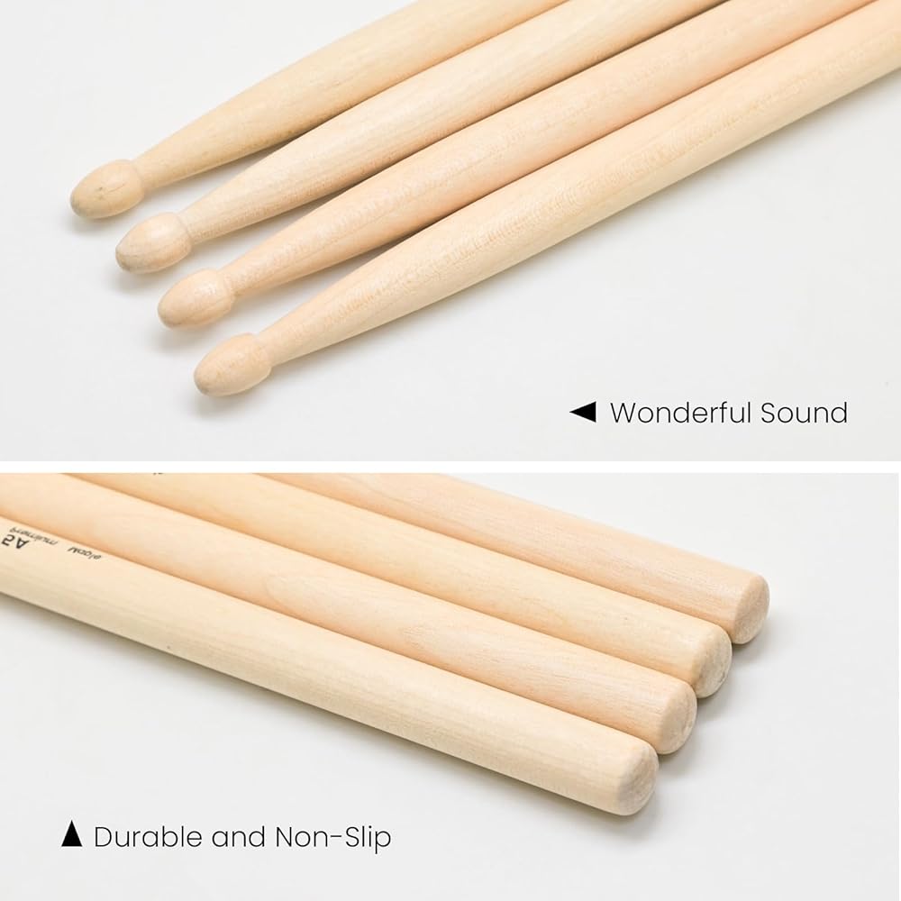 Drum sticks combine the elegant north American maple wood for a smooth and polished body, offering both sturdy construction and smooth touch that you can feel more comfortable and confident when playing drum on the stage, which is perfect for intermediate players or professionals who start to practice on. This drumsticks set is intended for professionals or beginner use, BUT never a simple stick! Definitely a great drumstick set for drummers to practice, give a show, relax and express creativity.