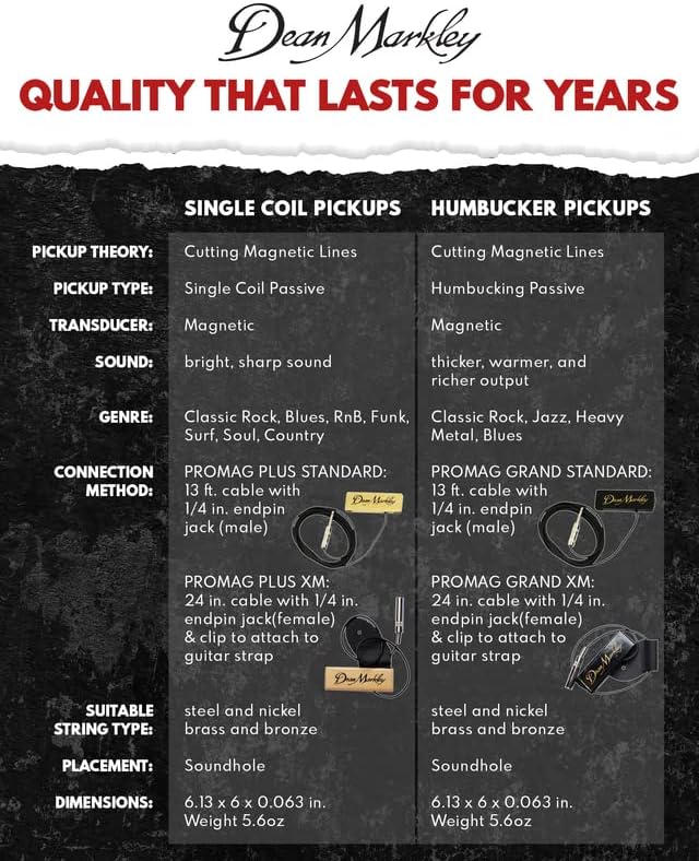 توازن ممتاز للسلسلة مع نغمات أكثر وضوحًا وإشراقًا. يُنتج التقاط الجيتار الصوتي Dean Markley Pro Mag Plus XM تناغمات تشبه الجرس مع صوت جميل وواضح ونطاق ديناميكي واسع، مما ينتج نغمة دافئة وغنية مثالية للأوتار.