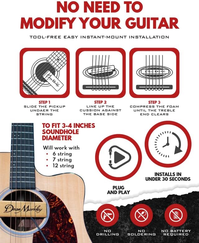 قم بالتوصيل والتشغيل على الفور مع التثبيت السريع. إن فتحة الصوت ذات الملف الواحد Dean Markley Pro Mag XM سهلة التركيب والإزالة للغاية دون الإضرار بجيتارك. لا حاجة للحفر، فقط قم بتوصيله وتشغيله مباشرة بمجرد إخراجه من الصندوق.