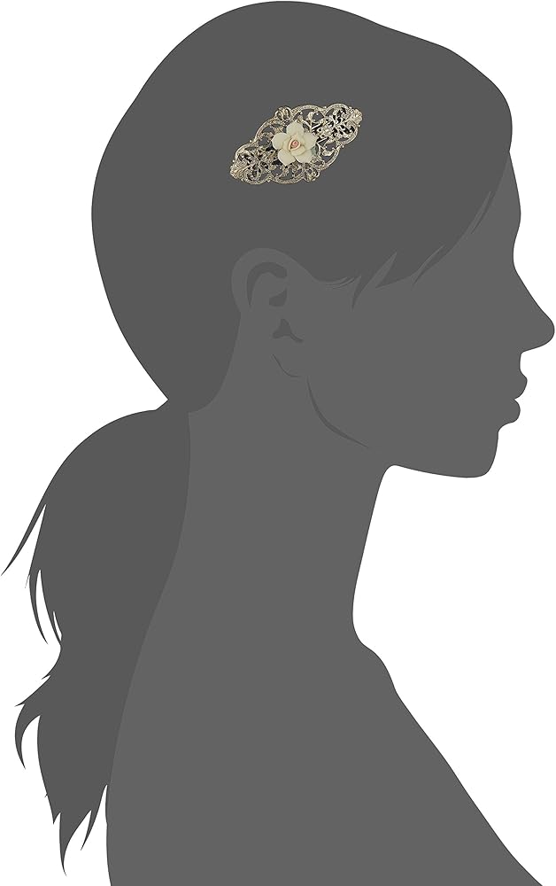 This stunning detailed vintage style filigree hair barrette features a pee pink porcelain flower (rose) with green petal & an easy to use silver French barrette closure. A perfect hair accessory for everyday use. Available In Pink And Ivory Color Measurements:Â 2.75"L x 1.5"W (Rose 0.67"W x 0.67"L)Â Made In USA PORCELAIN ROSE COLLECTION Our enchanting Porcelain Rose Collection features charming pieces with a feminine, vintage feel. Gold-tone & silver-tone styles are decorated with roses made of genuine porcelain for a delicate look that adds an antique charm to any ensemble. The rose is the symbol of love, power, feeling, and courage once thought to be associated with Aphrodite the goddess of love. Genuine porcelain roses have been with us since the very beginning and we continue to grow our garden with new looks. From our delicate rose earrings and necklaces to our hair barrettes and pins, this truly romantic symbol adds a delicate look to any style. Make your own statement by adding antique charm to any outfit.