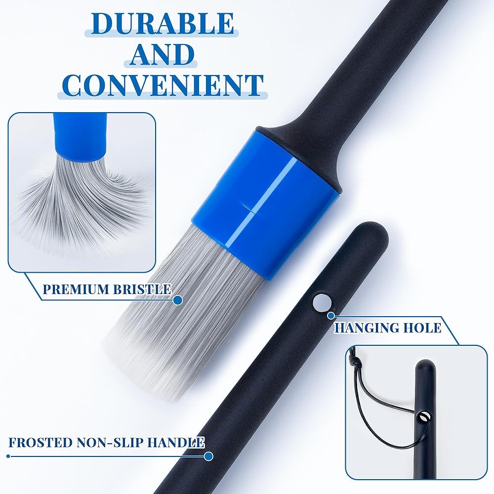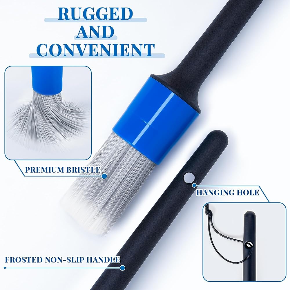 4. تصميم التفاصيل: تم تصميم فرشاة تفاصيل السيارة بمقبض مريح لقبضة مريحة؛ نهاية المقبض بها فتحة تعليق لسهولة التخزين؛ المقبض البلوري مصنوع من مادة البولي بروبيلين عالية الجودة ومقاوم للتآكل والقاعدة الحمضية.