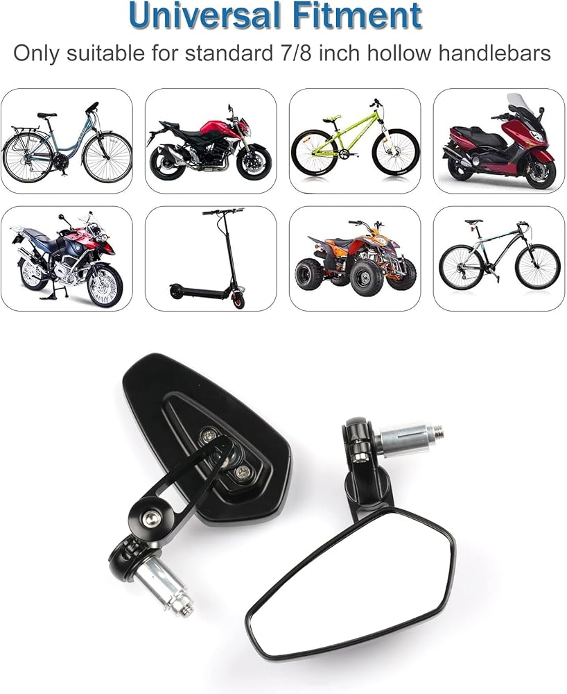 قابلة للتطبيق على نطاق واسع: مرآة رؤية خلفية ذات نهاية قضيب مقاس 7 / 8 عالمية، مناسبة للمقاود ذات الأحجام المناسبة مثل الدراجات النارية والمركبات الكهربائية والدراجات الرياضية وما إلى ذلك. (ملاحظة: إنها مناسبة فقط لتركيب المقاود اليمنى)