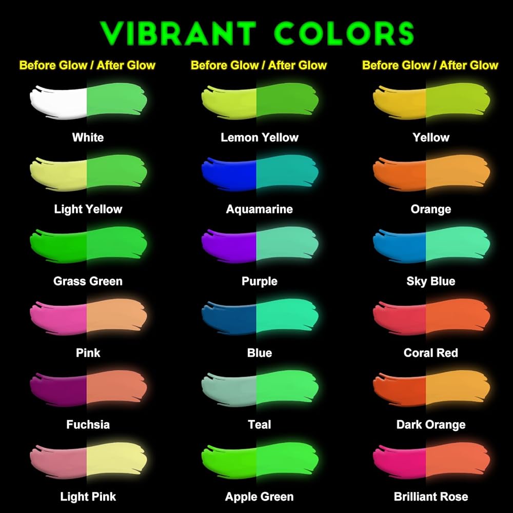 • التطبيق: مجموعة الطلاء المتوهجة في الظلام مثالية للفنانين والهواة والطلاب والأطفال فوق 12 عامًا. استخدمها لتزيين أزياء الهالوين والكريسماس وعيد الفصح وعيد الشكر وأعياد الميلاد والحفلات والمناسبات الخاصة الأخرى. يمكن لألوان الفلورسنت المضيئة ذاتيًا أن تضيء المساحات الداخلية والخارجية، مما يجعل الليالي المظلمة نابضة بالحياة ومبهجة.