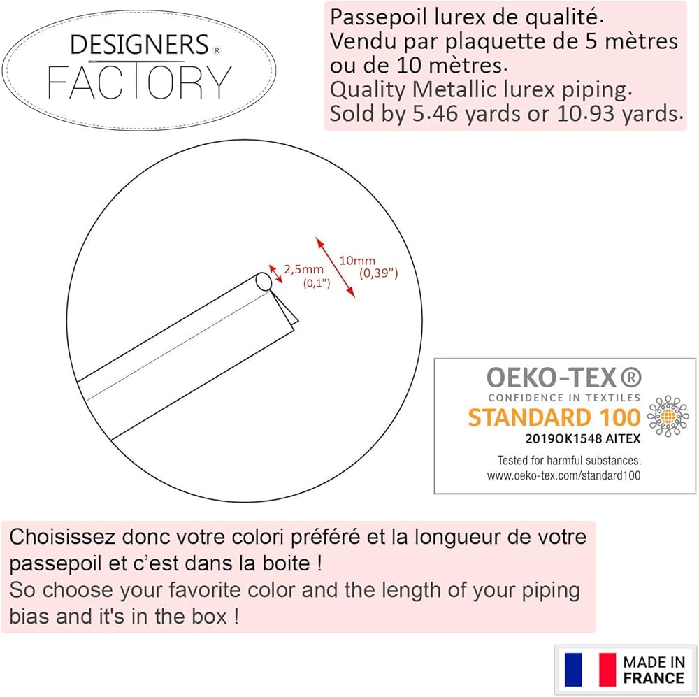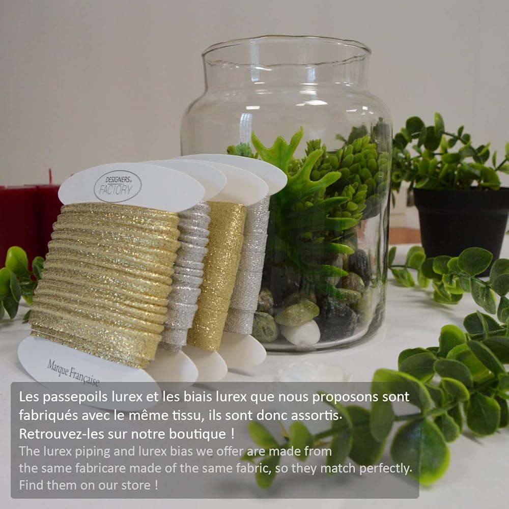 Metallic gold or silver piping trim - The width of the total ribbon is 0,39" (1cm) and the Piping thickness: 2.5mm or 0.1 inches. It is sold in lots of 5.46 yards (5 meters) or 10.93 yards (10 meters). To sew as you wishbone, between 2 fabrics, to ennoble your creations, fashion, decoration... French company located in the Paris area, you can contact me by message in French, English, German... I'm here to answer you! A question, a concern, need a sewing advice or simply an opinion, I have been a fashion designer for more than 15 years and I am available to help you at any time !