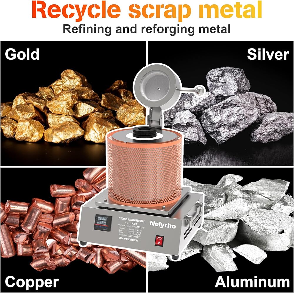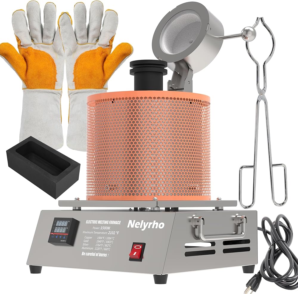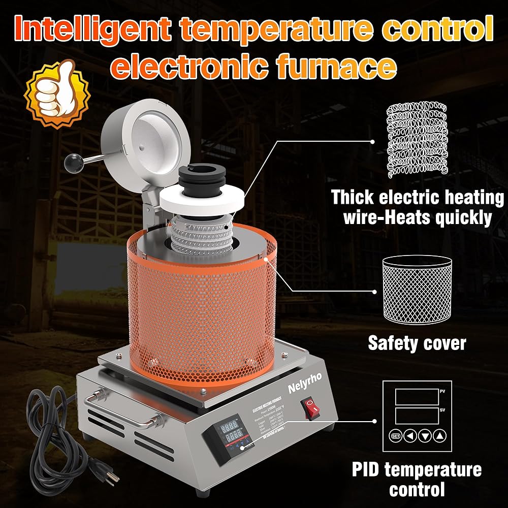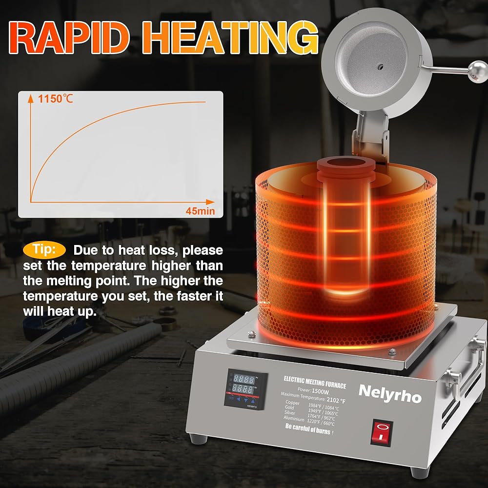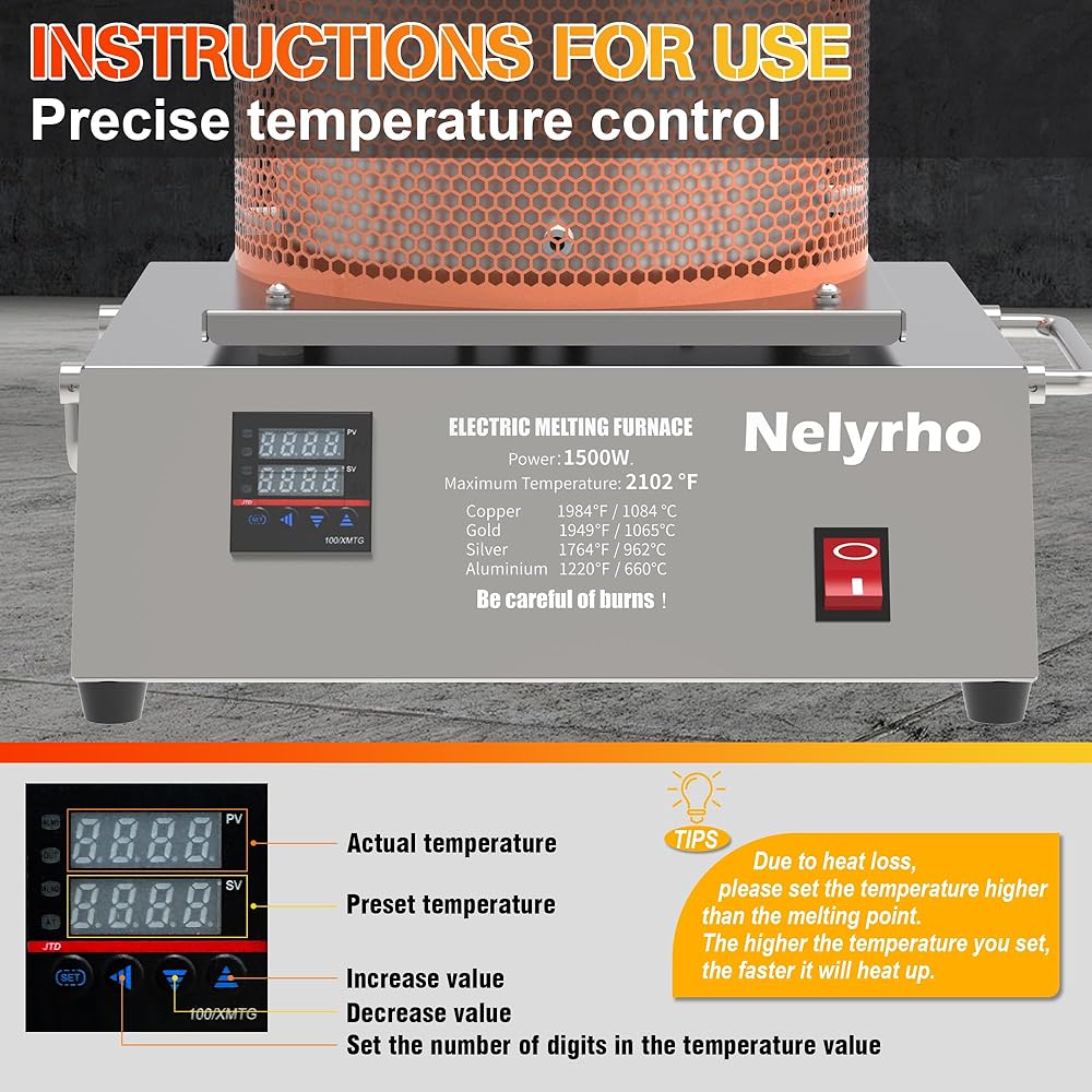 طاقة 1400 واط: فرن الصهر الإلكتروني عالي الطاقة Nelyrho درجة الحرارة القصوى 2102 درجة فهرنهايت/1150 درجة مئوية. يذوب الذهب والفضة النقية والنحاس النقي والألومنيوم بشكل أسرع (الجهاز الذي تم ضبطه على درجة حرارة أعلى من نقطة انصهار المعدن سوف يسخن ويذوب بشكل أسرع).