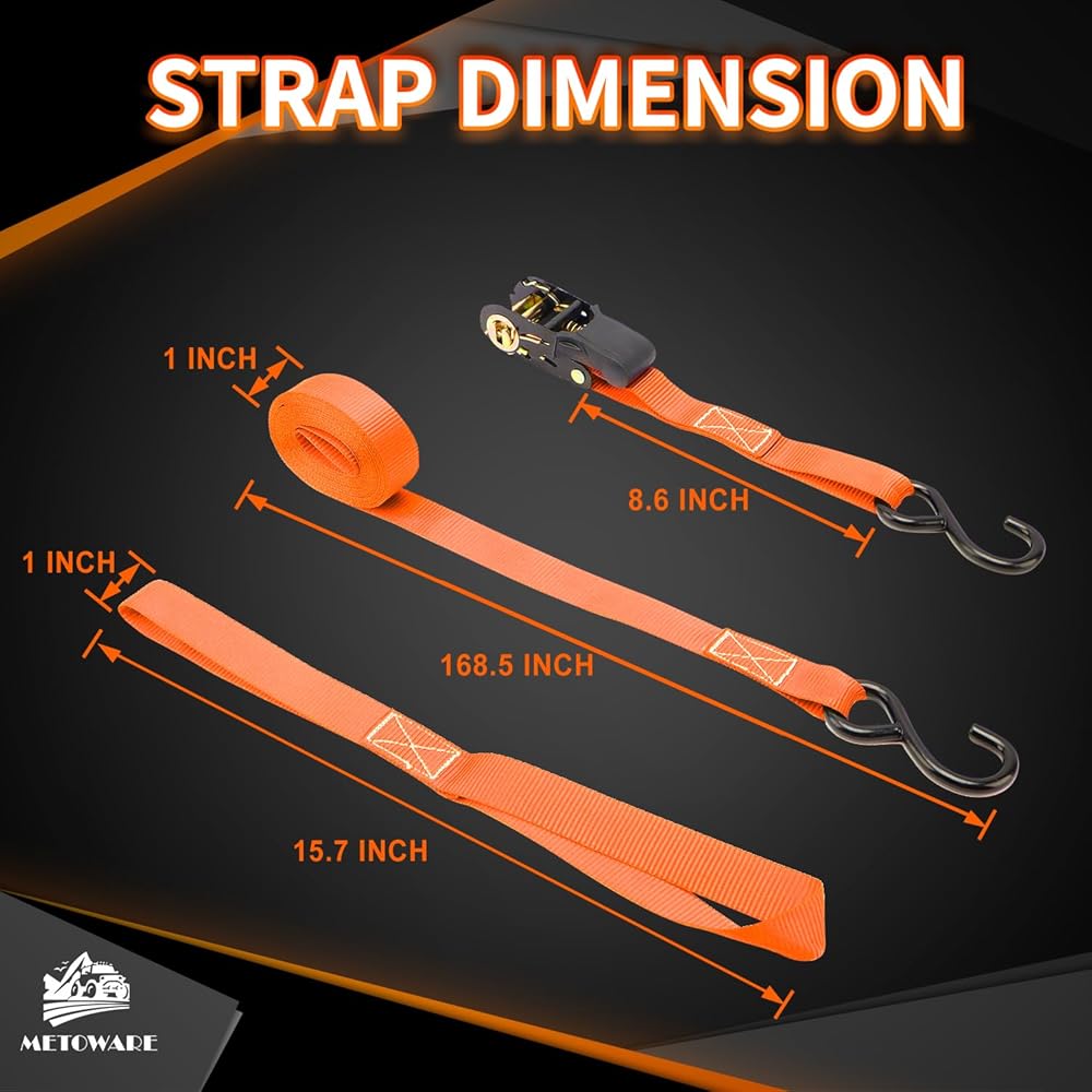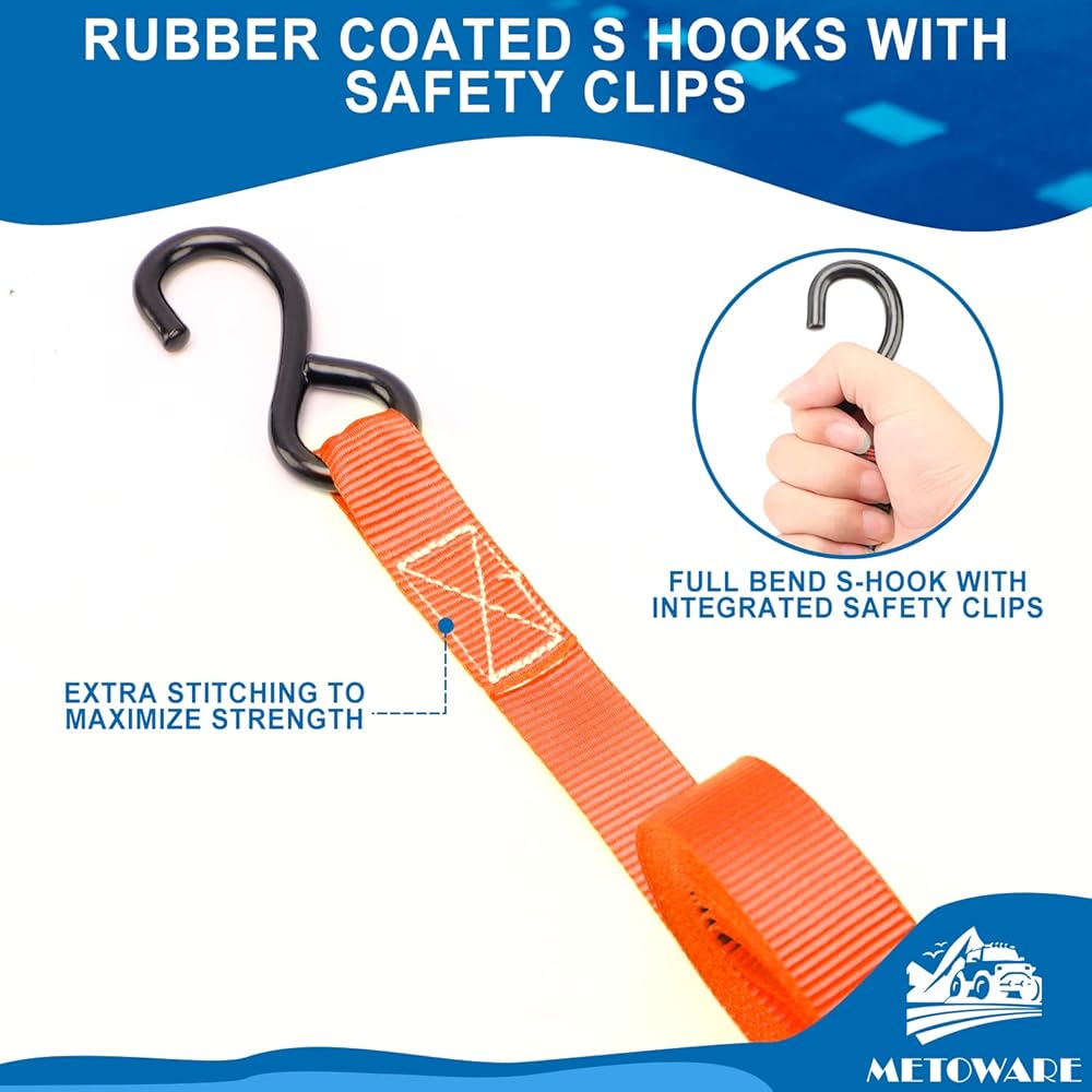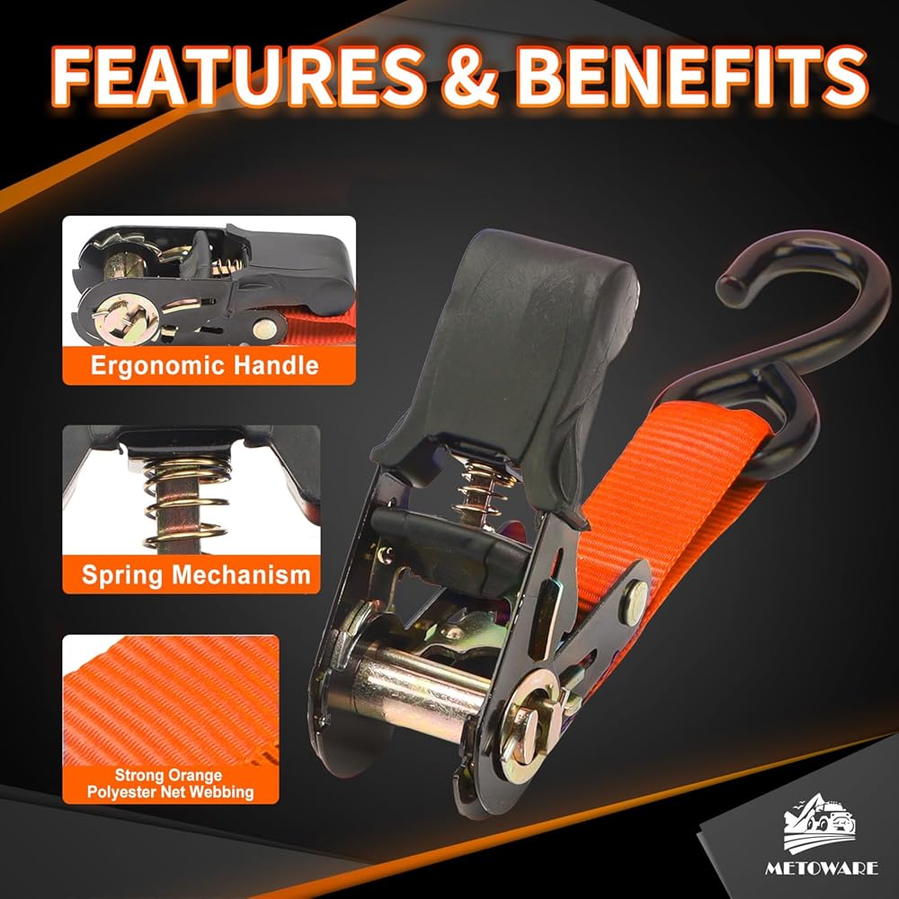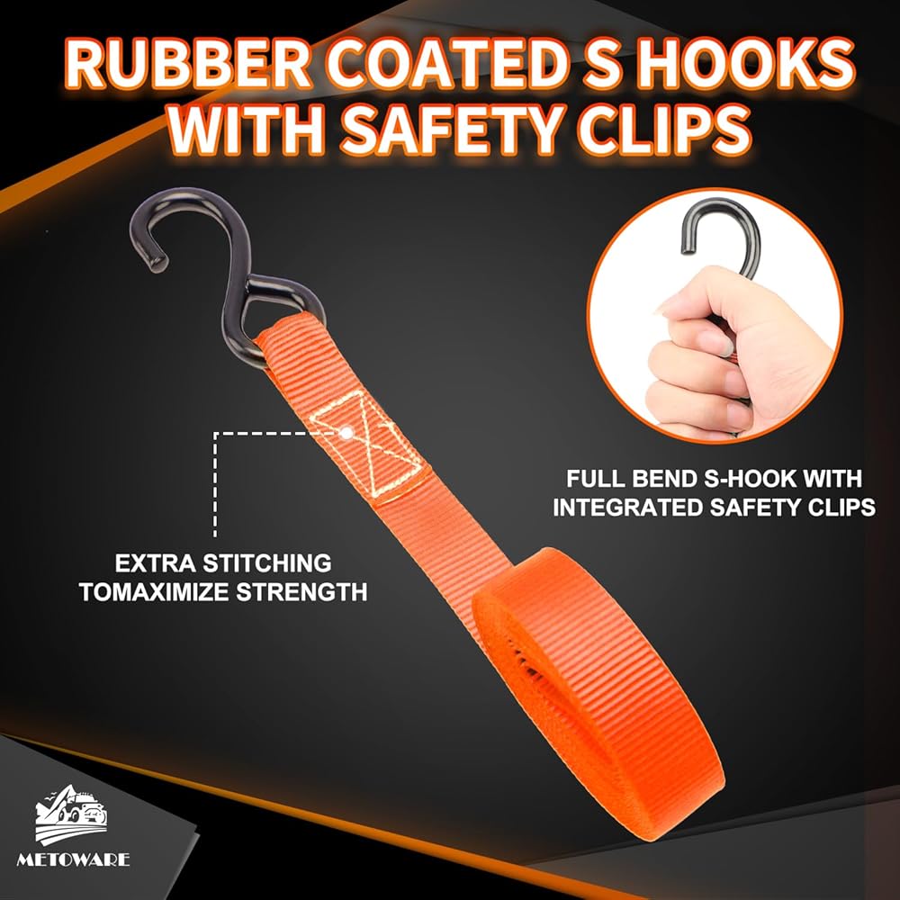 • قوة فائقة - حزام السقاطة مقاس 2.54 سم مصنوع من نسيج البوليستر المتين مع نمط غرز قوي يمكن أن يوفر قوة شد ممتازة تصل إلى 1764 كجم. مع 4 آليات سقاطة شديدة التحمل، و4 خطافات عميقة على شكل حرف S وحزام لضمان سلامة بضائعك أثناء النقل