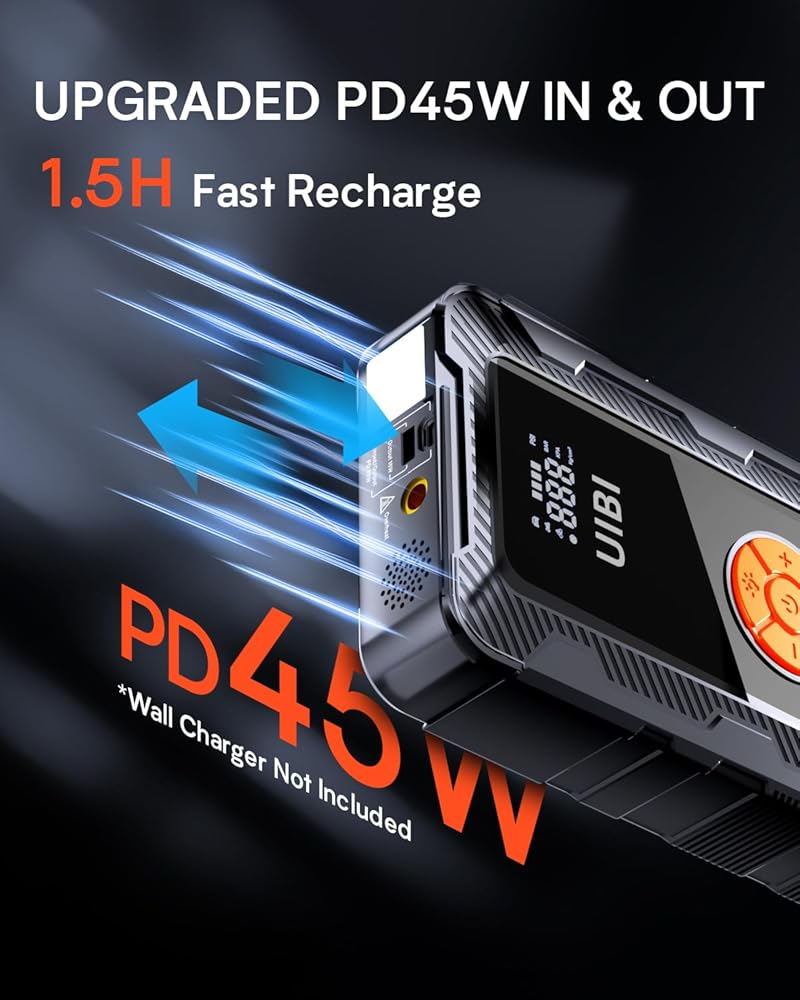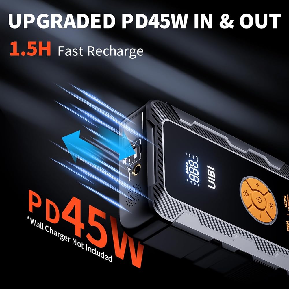 【أسرع 3 مرات من أي وقت مضى】 قام جهاز تشغيل السيارة المحمول UIBI مع ضاغط الهواء بترقية وظيفة الشحن السريع في عام 2023. ليس فقط منفذ إخراج USB-A (QC3.0 5V/3A 9V/2A 12V/1.5A) ولكن النوع C منفذ ثنائي الاتجاه (PD45W 5V/3A 9V/3A 12V/3A 15V/3A 20V/2.25A) يدعم الشحن السريع. يمكنك شحن أجهزة USB المختلفة الخاصة بك بسرعة من خلال أي منفذ. يمكنك أيضًا شحن صندوق توصيل البطارية بسرعة من خلال Type-C PD45W الذي يمكن شحنه بالكامل في حوالي 1.5 ساعة في أسرع وقت، وأسرع 3 مرات من الأجهزة الأخرى!