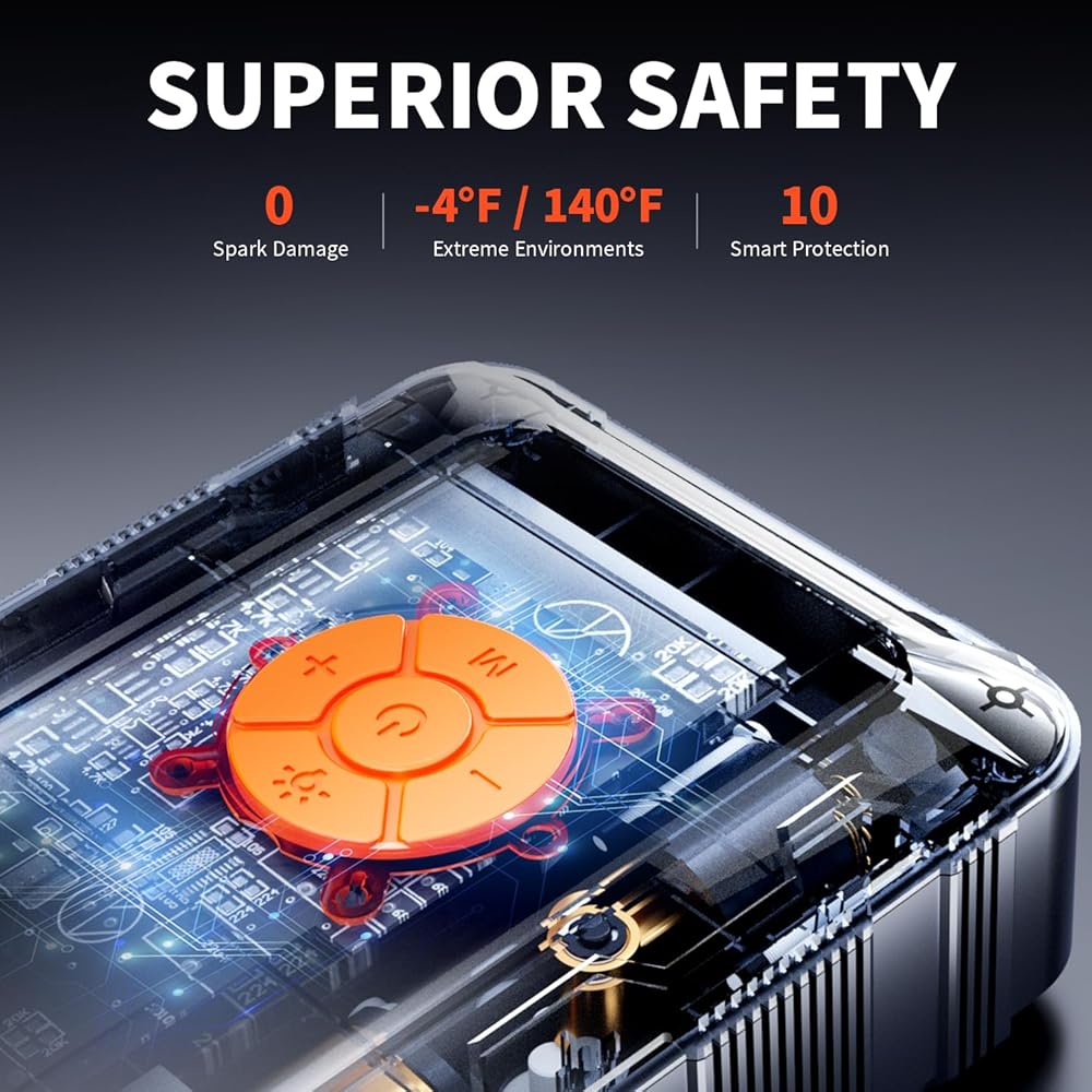 【أمان وحماية عاليين】بطارية السيارة مدمجة في 10 وسائل حماية ذكية للسلامة، بما في ذلك مقاومة الشرر، وقصر الدائرة، وحماية درجة الحرارة العالية/المنخفضة، وما إلى ذلك. يمكنك تشغيل سيارتك بسهولة وبسرعة حتى في البيئات القاسية ( -4 درجة فهرنهايت إلى 140 درجة فهرنهايت). يعطي معزز البطارية هذا الأولوية للسلامة وسهولة الاستخدام. إنها ليست معتمدة من قبل UL-2743 فحسب، بل تحتوي أيضًا على مؤشر وصل يقوم بالإنذار تلقائيًا في ظل ظروف غير طبيعية لحمايتك بالكامل وسيارتك من أي عمليات غير مناسبة.