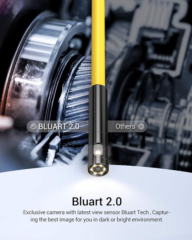 عدسة مزدوجة بدقة 1080 بكسل مع شاشة مقسمة: استكشف المناطق الضيقة دون عوائق مع ميزة العدسة المزدوجة وشاشة مقسمة بدقة 1080 بكسل. يمكن للكاميرا الثعبانية ذات العدسة المزدوجة فحص نطاق 70 درجة في الأمام وجانبها بتصميم مريح. النطاق البؤري للكاميرا الأمامية هو 3-8 سم / 1.2-3.1 بوصة والكاميرا الجانبية 2-6 سم / 0.8-2.4 بوصة . من السهل الاتصال والإعداد.