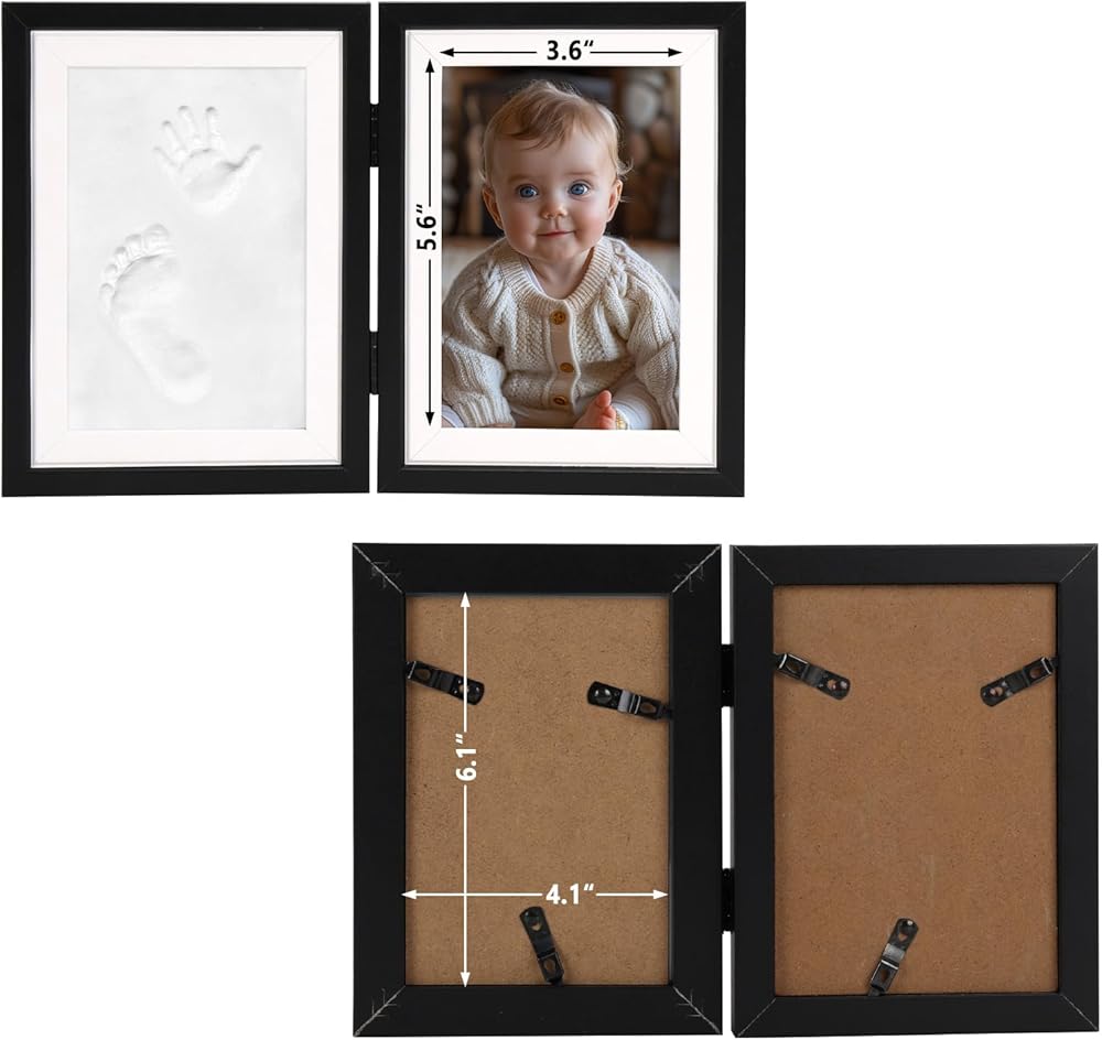عرض المكتب: يمكن لإطار الصورة المفصلي أن يحمل صورة مقاس 4x6 ويعرض الجانب الآخر بصمة يد الطفل، وإطار الصورة 4x6 فقط لعرض الطاولة والمكتب.