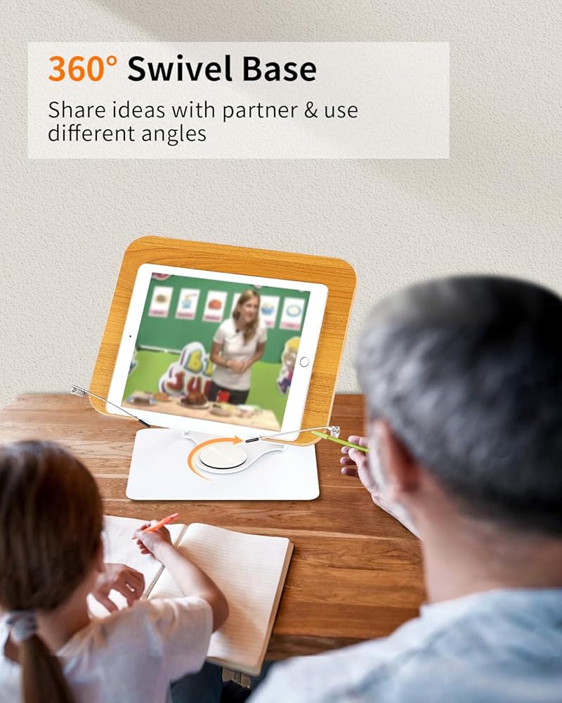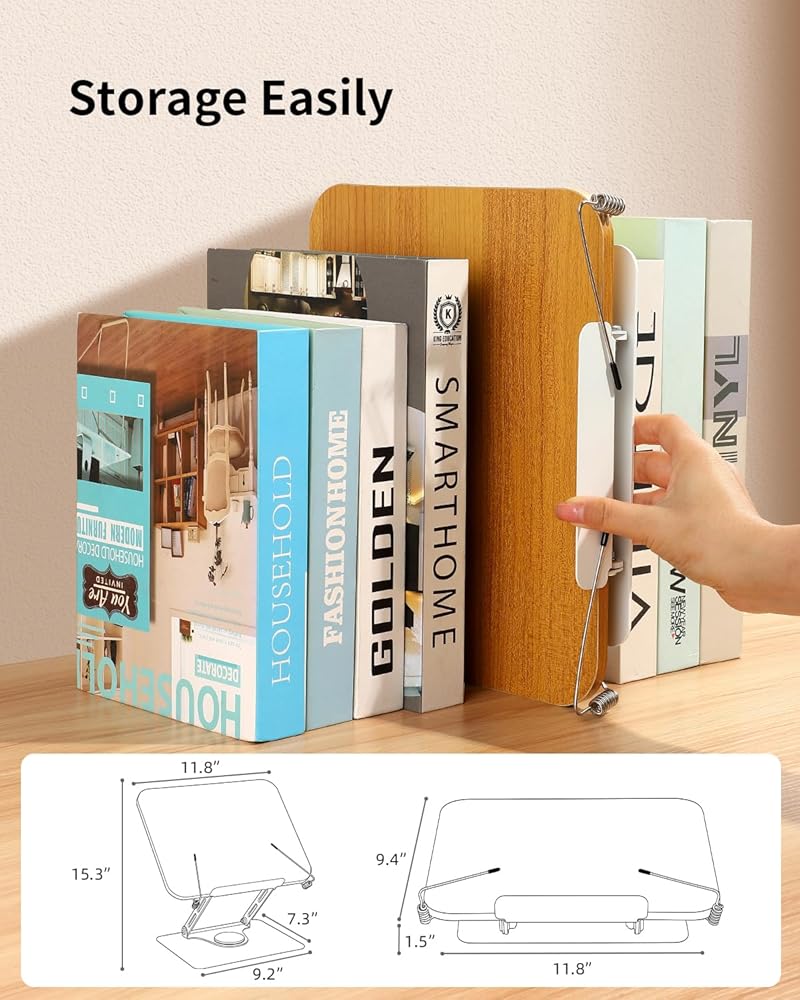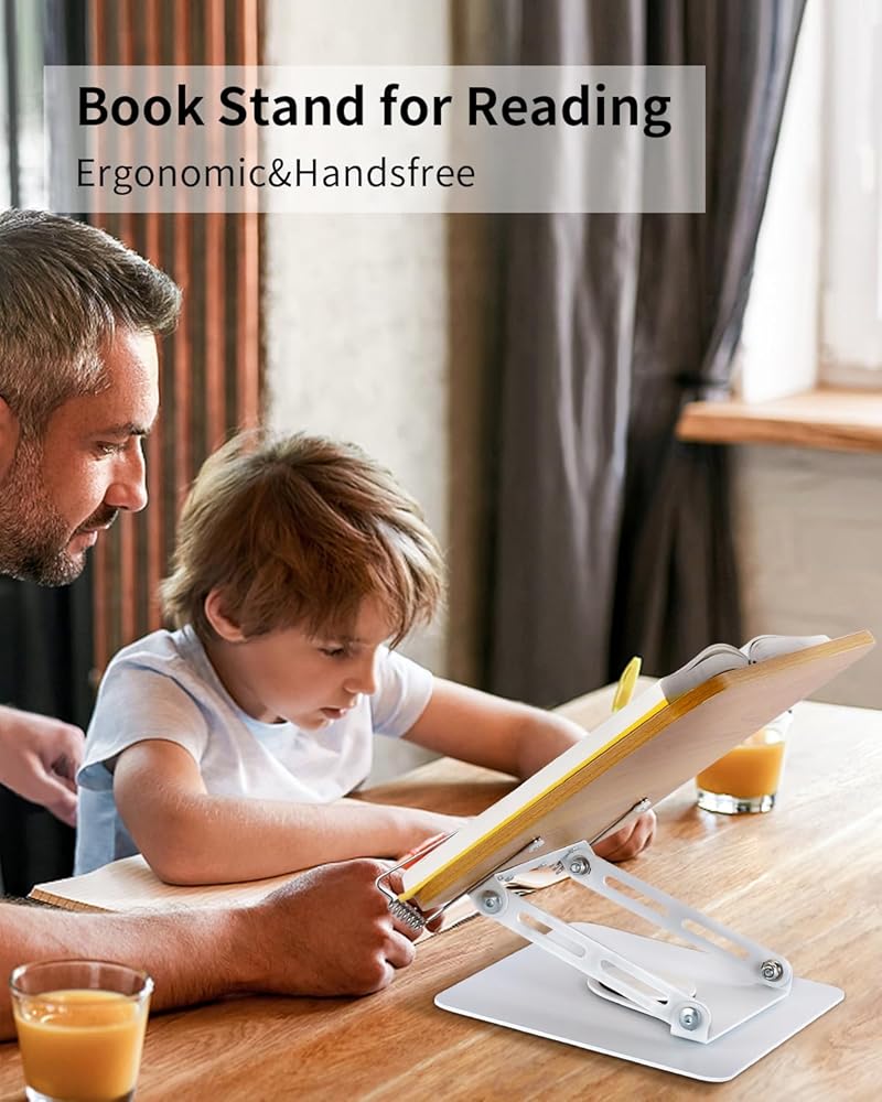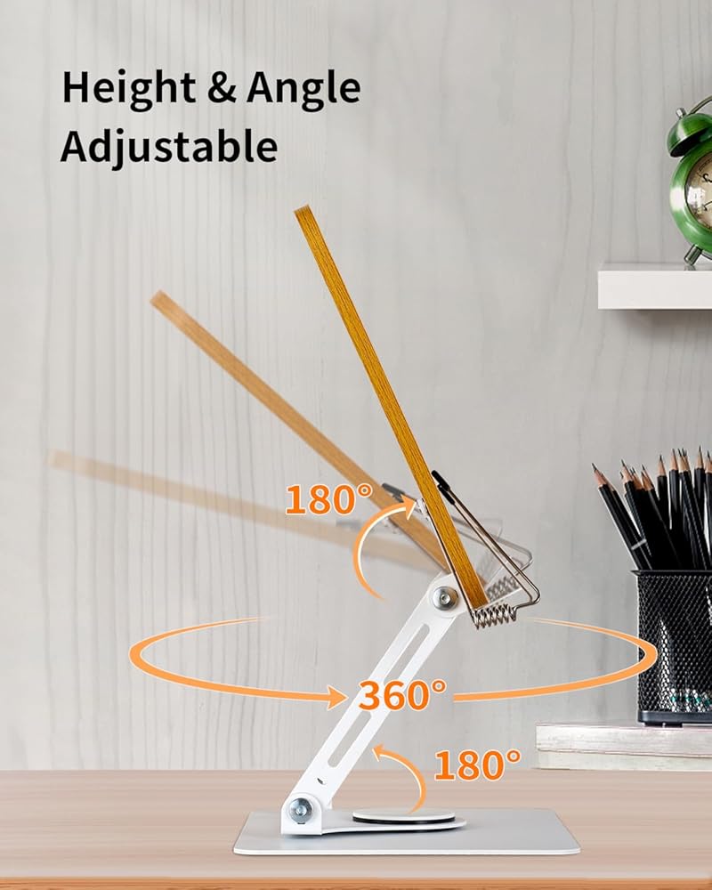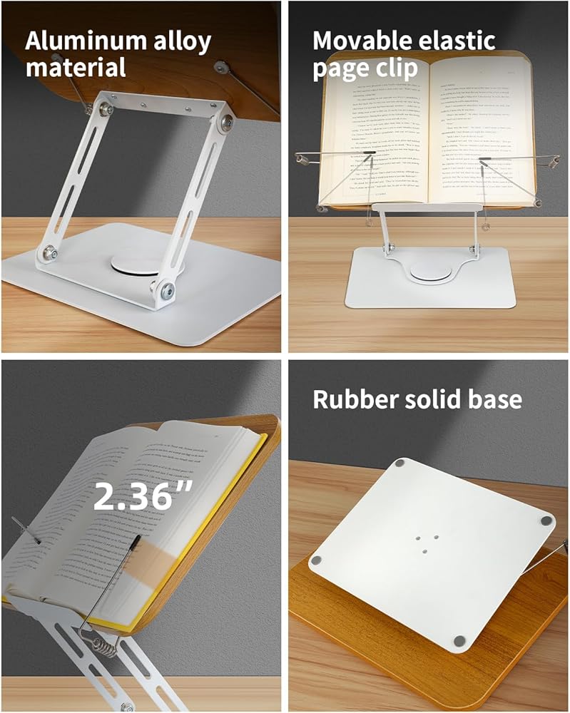 حامل كتب للقراءة - حامل كتب قابل للتعديل بقاعدة تدور 360 درجة وحامل سطح مكتب قابل للطي للكتب والوصفات والكمبيوتر المحمول والرسم والموسيقى وحامل كتب الطبخ ومشابك الصفحات المرنة، بدون استخدام اليدين، الألومنيوم