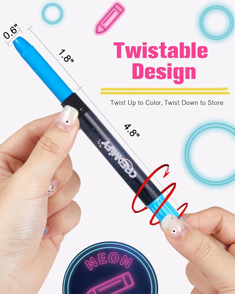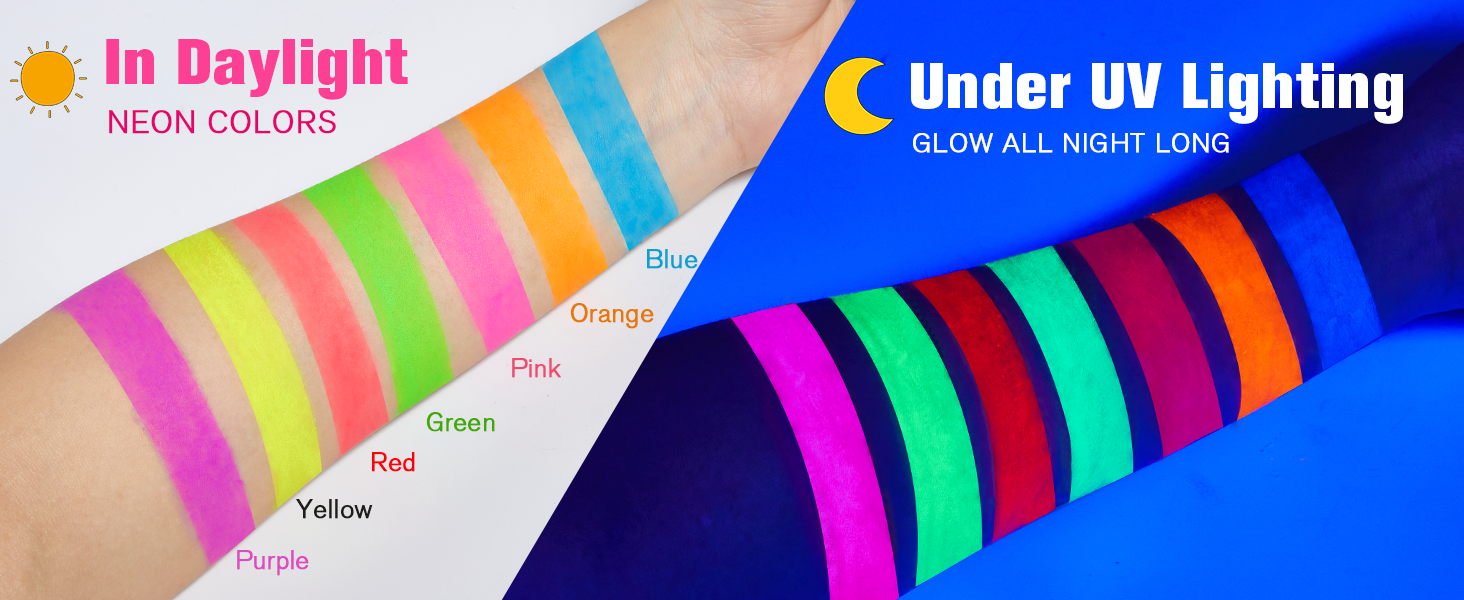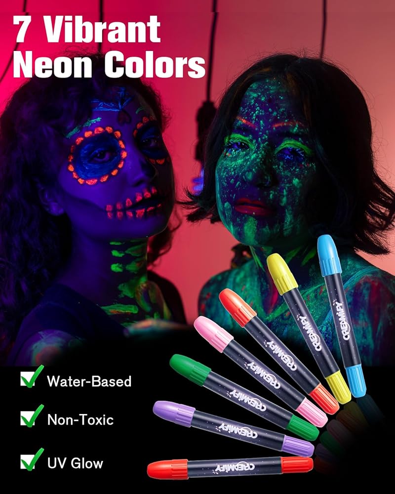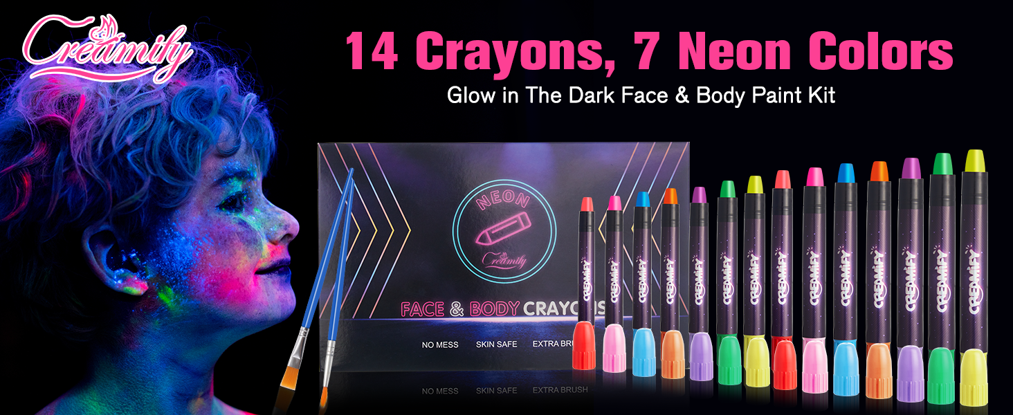 • 🌈يتوهج في الطلاء بالأشعة فوق البنفسجية: كريميفاي 14 قلم تلوين نيون يتميز بـ 7 ألوان فلورسنت نابضة بالحياة تتألق بشكل مشرق تحت ضوء الأشعة فوق البنفسجية أو الضوء الأسود، مما يخلق تأثيرات مكياج لافتة للنظر. ملاحظة: لا يمكن لطلاء الوجه أن يتوهج في الظلام مباشرة.