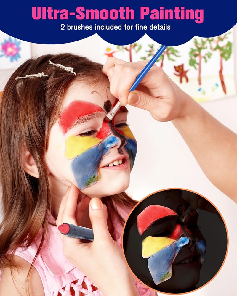 • 🌈آمن على البشرة الحساسة: تم تركيبه من أصباغ صالحة للطعام ومكونات آمنة على البشرة، طلاء جسم الوجه الخاص بنا خالي من الغلوتين وغير سام ولطيف على البشرة الحساسة، مما يجعله مناسبًا للأطفال والكبار على حد سواء.