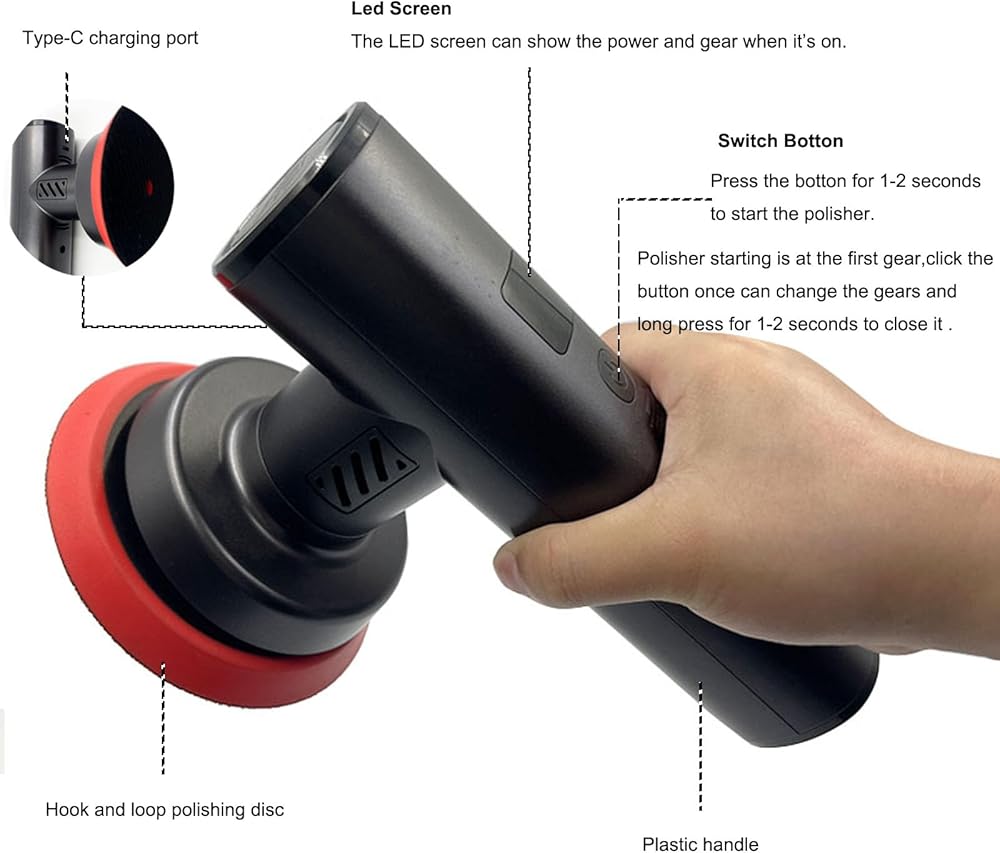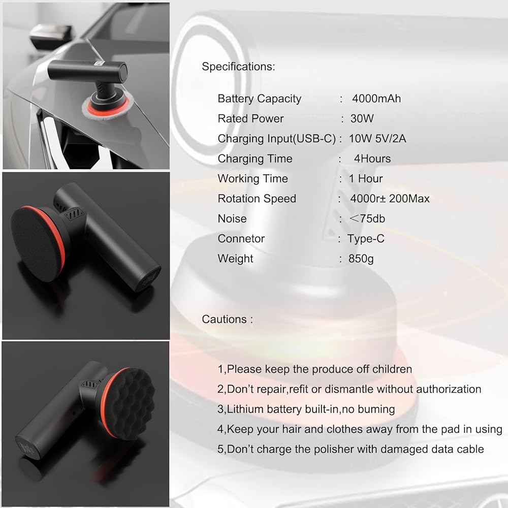 Adopted the latest technology:The car polishing machine has been able to design a compact and lightweight car polisher with an extended battery capacity of 4000mAh that can efficiently operate for 1 hour after 4 hours of charging(Type-C charging).