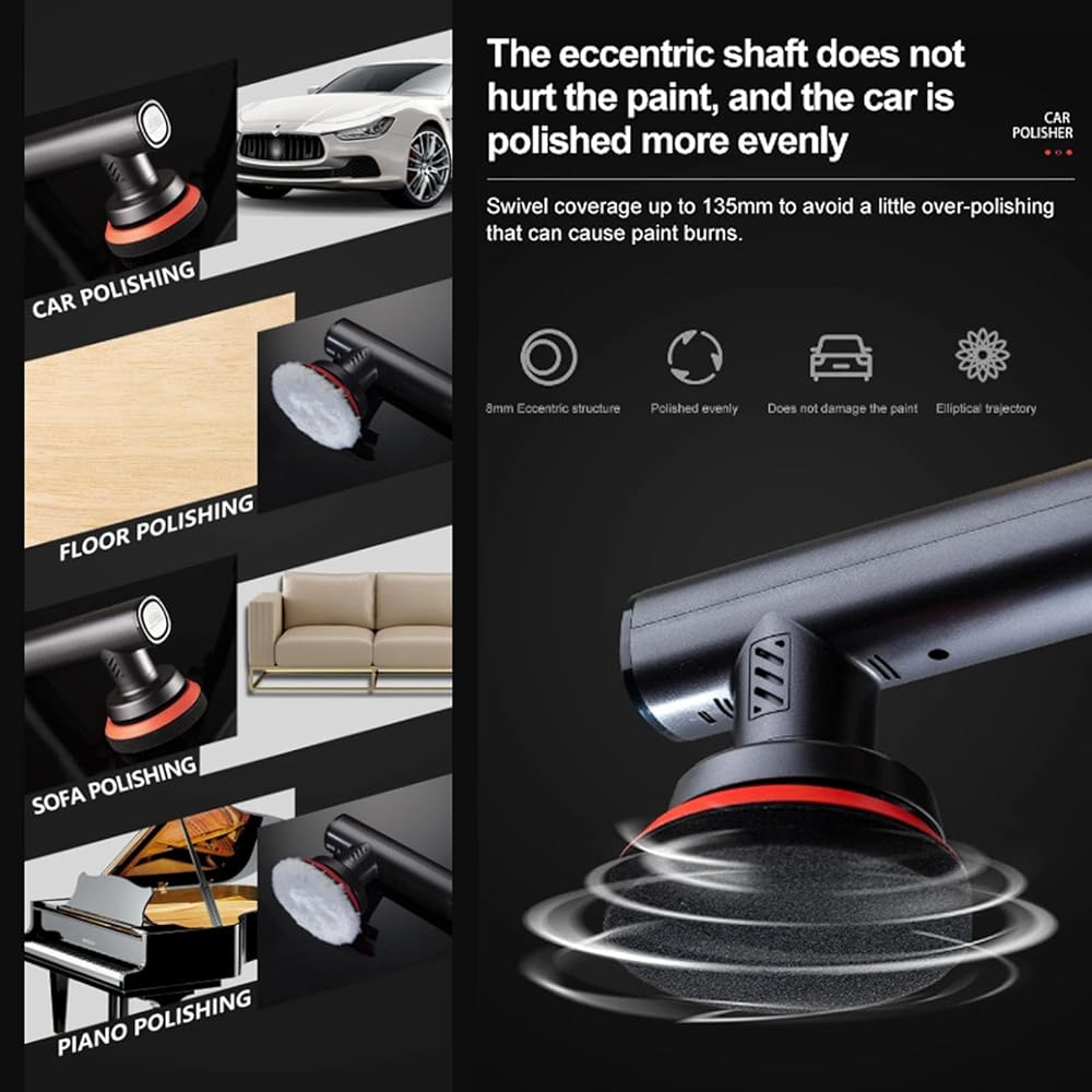 An eccentric rotating shaft:An oval track polishing disc helps avoid polishing one area too much and spread the wax paint evenly for smoother paint surface.