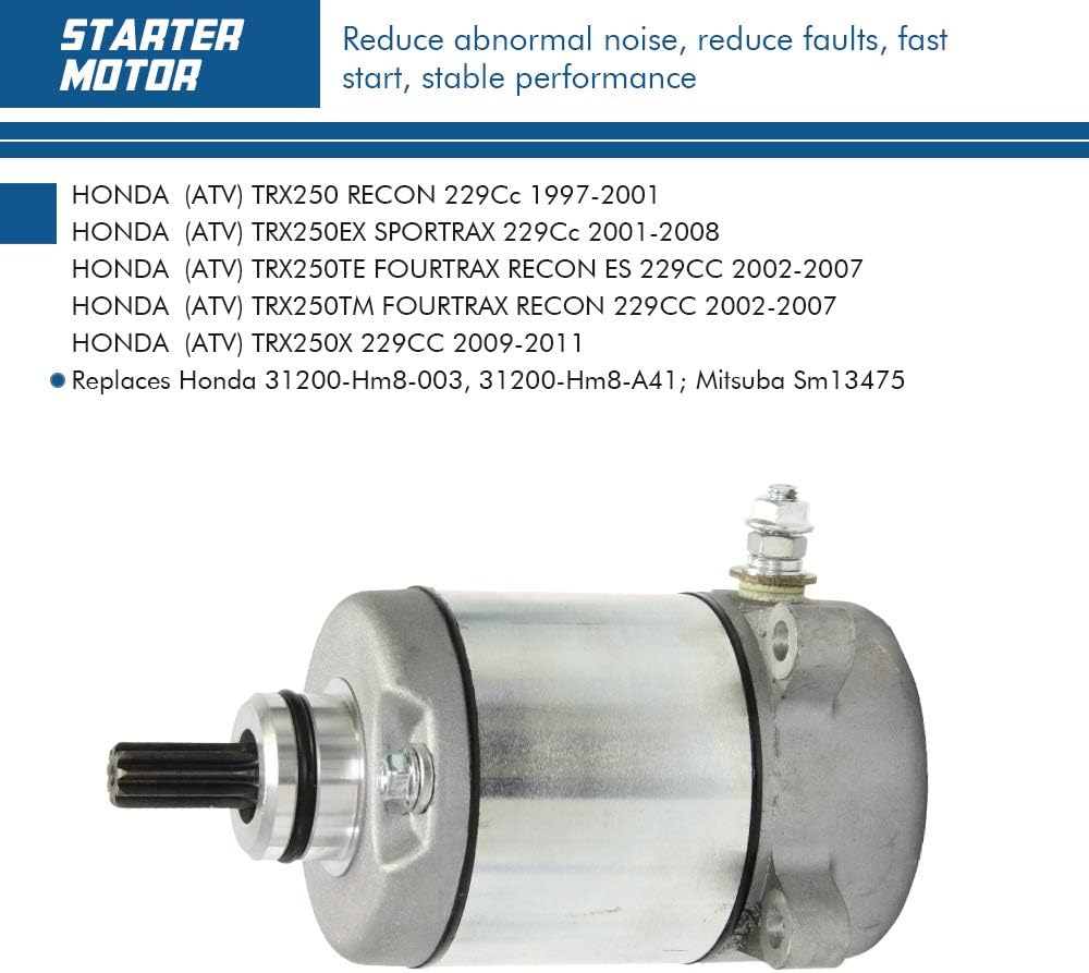 التطبيق: هذا المحرك البادئ هو بديل مباشر لهوندا TRX250 Recon 229CC 1997-2001، TRX250EX Sportrax 229CC 2001-2008، TRX250TE Fourtrax Recon ES 229CC 2002-2007، TRX250TM Fourtrax Recon 229CC 2002-2007، TR X250X 229CC 2009-2019. 12 فولت، دوران عكس اتجاه عقارب الساعة. يستبدل هوندا 31200-Hm8-003، 31200-Hm8-A41؛ ميتسوبا Sm13475.