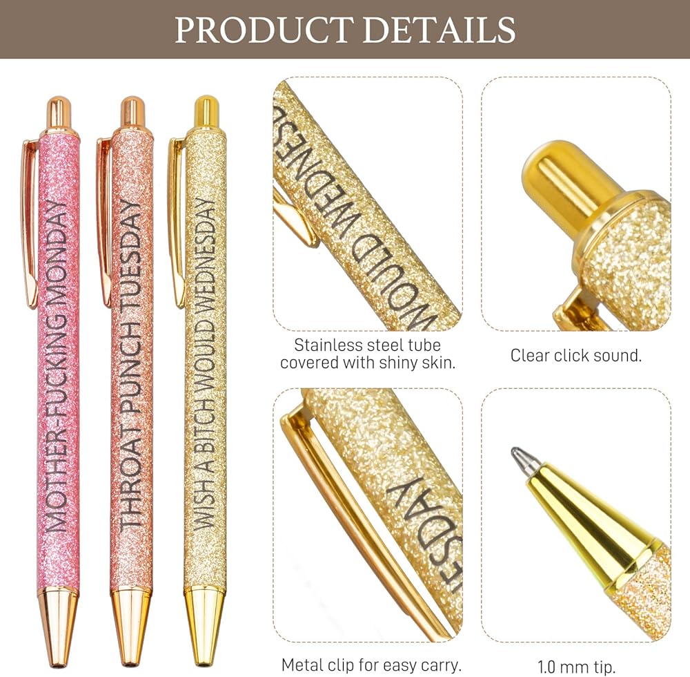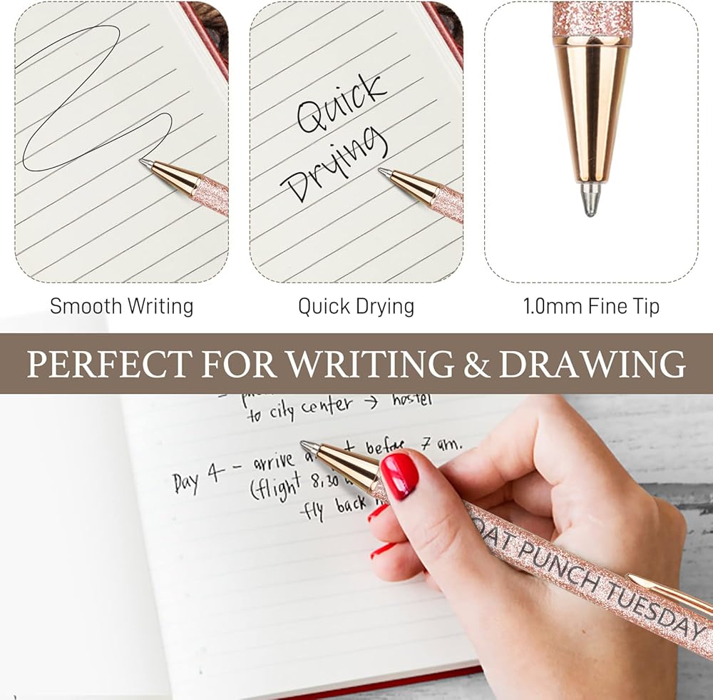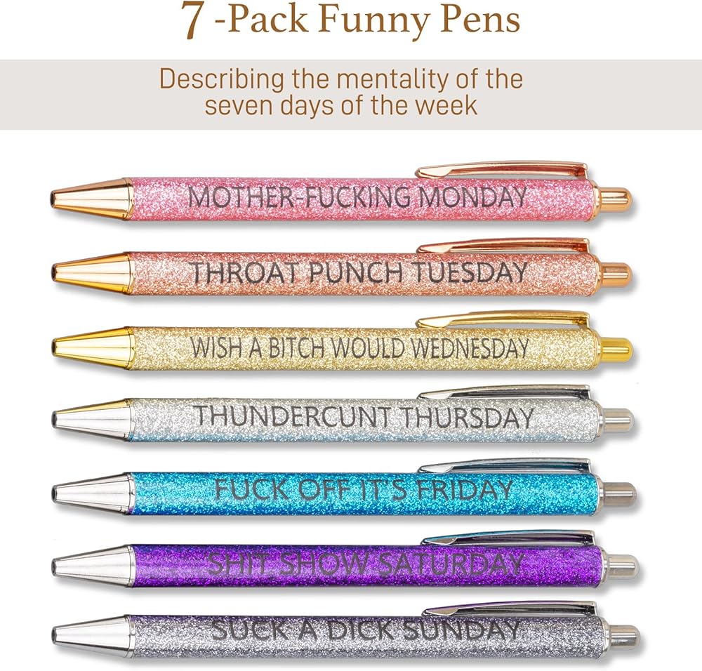 【مظهر ملون】هناك سبعة أقلام حبر جاف لامعة بألوان مختلفة تمثل أيام الأسبوع السبعة، كل منها ذو مظهر لامع وعبارة مزاجية لهذا اليوم. أداة كتابة أنيقة مصممة للأشخاص الذين يواكبون الموضة.