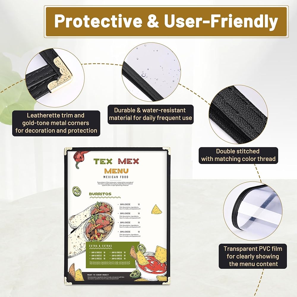 [أنيق وعالي الجودة]: يتميز بمادة ناعمة الملمس مع خياطة مزدوجة، زخرفة جلدية سوداء من جميع الجوانب، وزوايا مزينة بدقة بمعدن ذهبي أنيق، تصميمه الفاخر والأنيق يعزز الجو الراقي لمطعمك