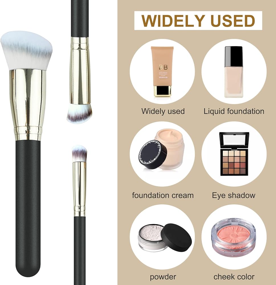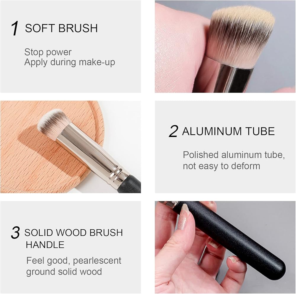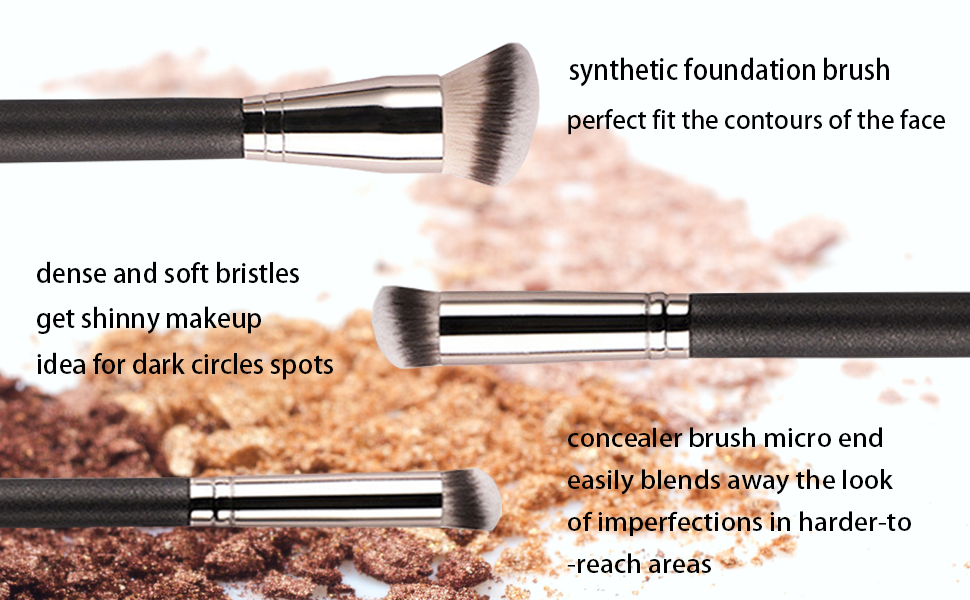 رأس فرشاة كريم الأساس والكونسيلر نستخدم شعيرات صناعية لجعلها ناعمة ولكن كثيفة بدرجة كافية لتوزيع المنتج بشكل متساوٍ، حلقة معدنية ممتازة لجعل الفرشاة متينة وليس من السهل تشويهها، مقبض الفرشاة مصنوع من الخشب ومثالي. مرجح وسهل الاستخدام