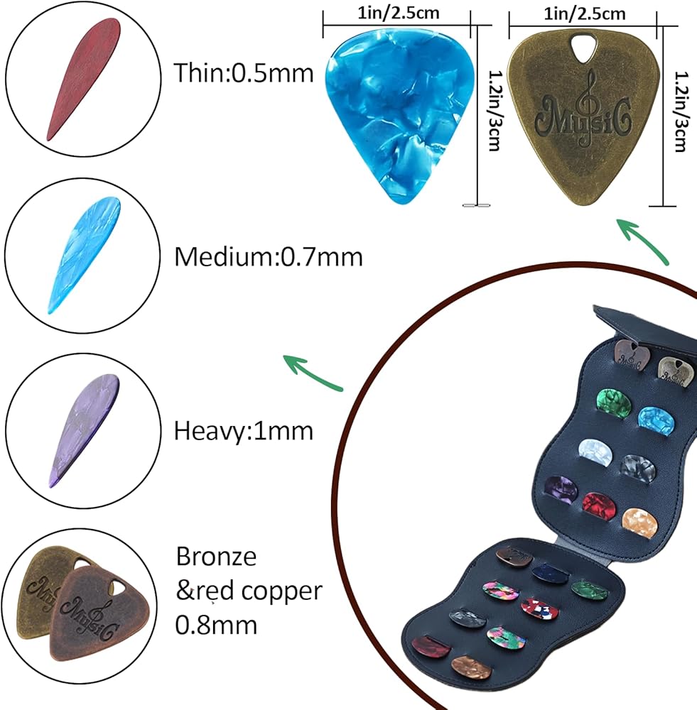 18 حزمة من أعواد الجيتار مع حامل، تتضمن 0.5،0.7،0.8،1.0 مم، مجموعة متنوعة من ريش السيلولويد الملونة وأعواد جيتار كوبر البرونزية للباس، القيثارة، الجيتار الكهربائي الصوتي