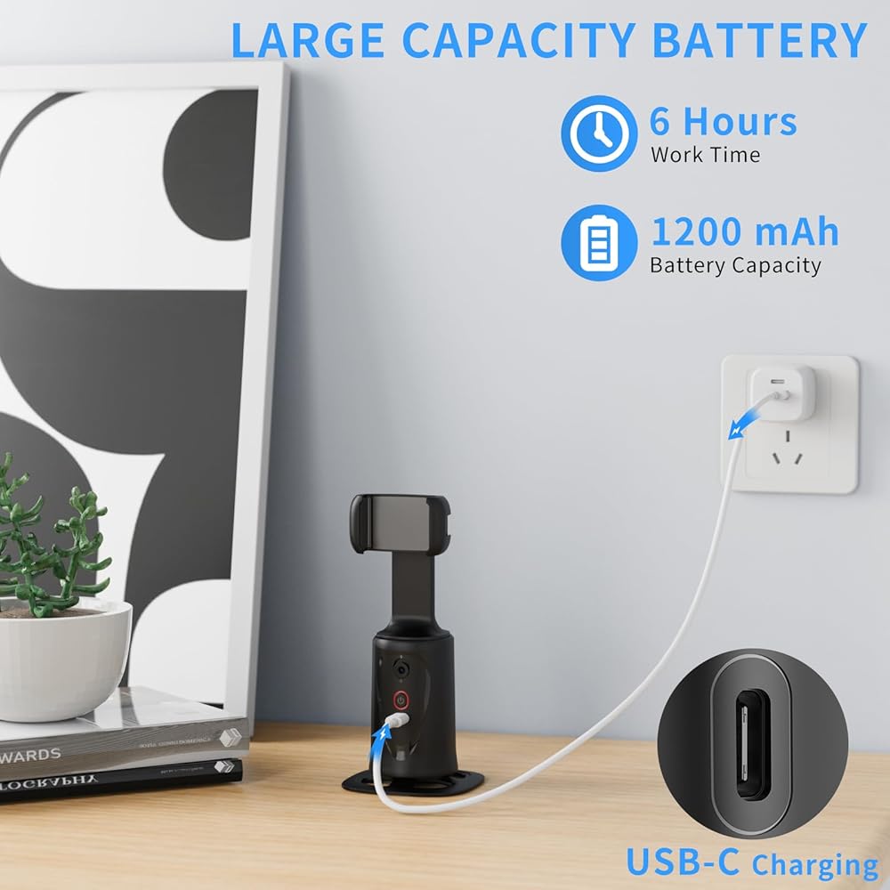 【أزرار دوارة 360 درجة وتعديل متعدد الزوايا】حامل ثلاثي لتتبع الوجه التلقائي مزود بزر تدوير تلقائي 360 درجة لتصوير فيديو بانورامي أفضل، ويمكن طي الحامل ذهابًا وإيابًا، ويمكن تدوير مشبك الهاتف الخلوي 360 درجة، لذلك لا توجد زاوية ميتة في التصوير والفيديو.