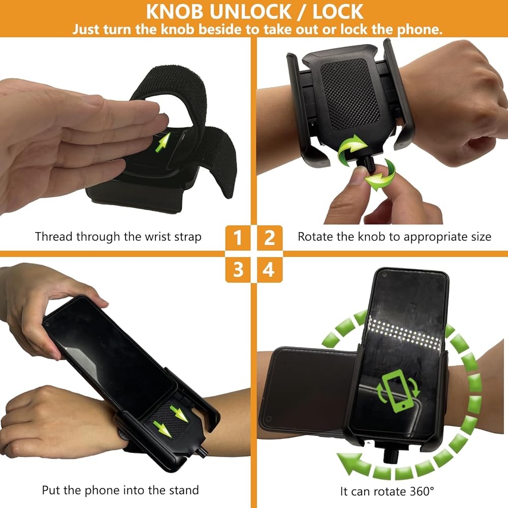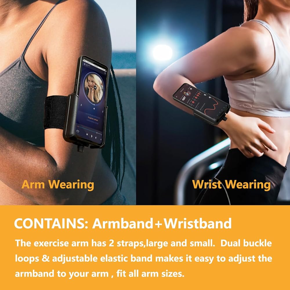 [حامل هاتف 2 في 1] يحتوي على: حزام يد + سوار معصم، ذراع التمرين يحتوي على شريطين، كبير وصغير. حلقات بإبزيم مزدوج وشريط مطاطي قابل للتعديل يجعل من السهل ضبط حزام اليد على ذراعك، ويناسب جميع أحجام الذراع.