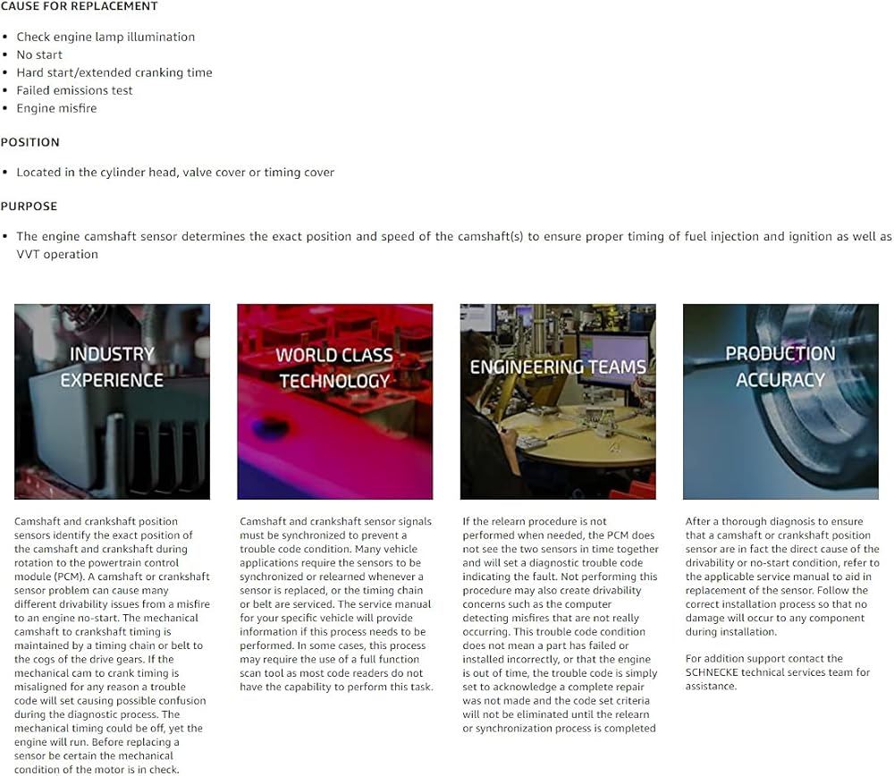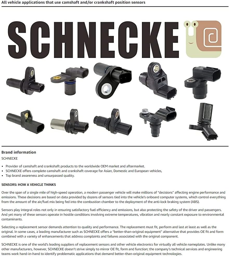 تقدم SCHNECKE تغطية كاملة لمستشعر موضع الكاميرا والكرنك للمركبات الآسيوية والمحلية والأوروبية، وأعلى مستوى من الوعي بالعلامة التجارية وجودة لا مثيل لها