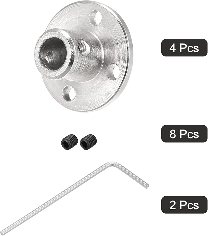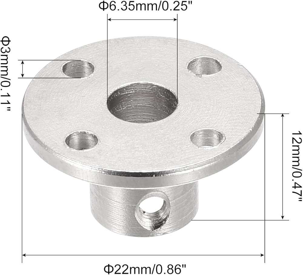 • Inner Diameter: 6mm/0.24 inch; Total Height: 12mm/0.47 inch; Cylinder Outer Diameter: 10mm/0.39 inch; Base Plate Diameter: 22mm/0.86 inch; Diagonal Screw Hole Distance: 16mm/0.62 inch; Base Plate Hole Diameter: 3mm/0.11 inch; Material: Iron Plating; Package Content: 4pcs x Rigid Flange Coupling, 2pcs x 1.5mm Mini Hex Wrench, 8pcs x M3 Fastening Screw.