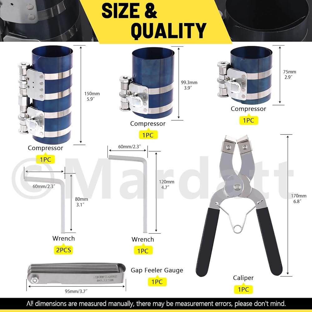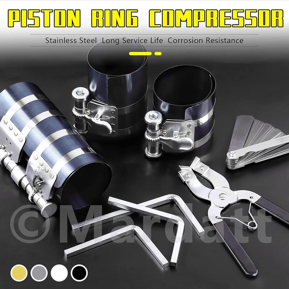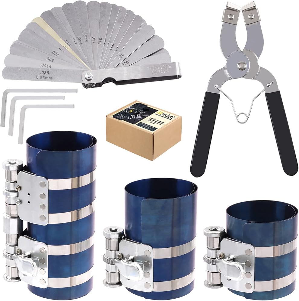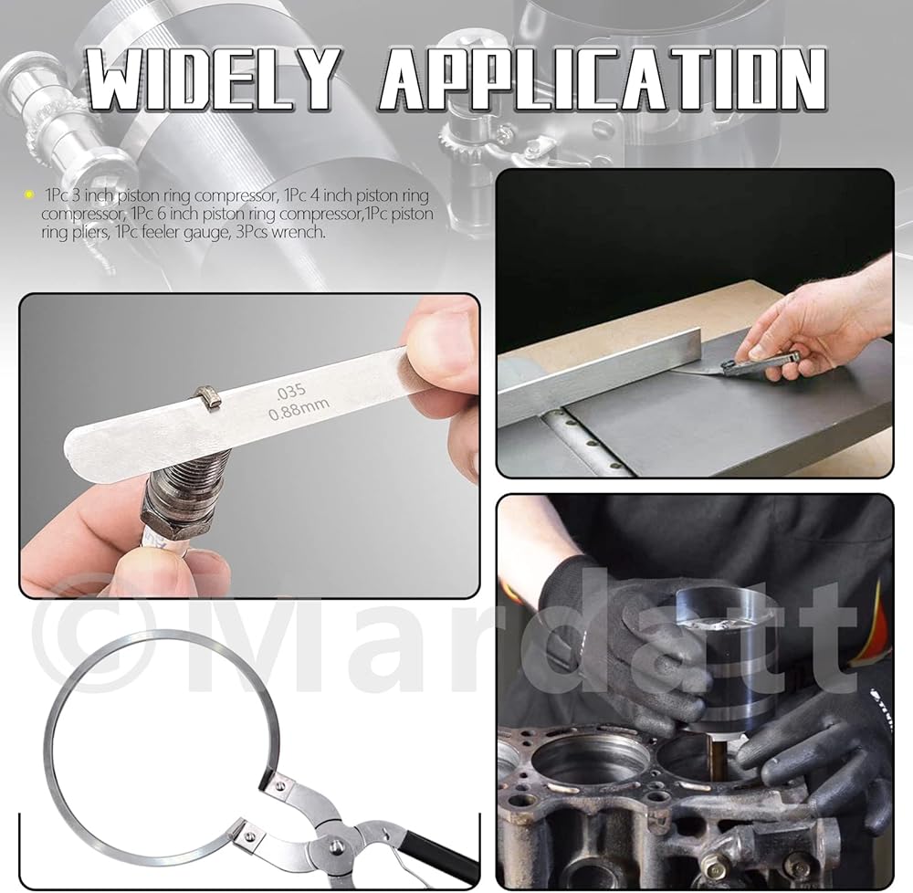 Mardatt 8 Pcs 3" 4" 6" Piston Ring Compressor Tool Set with Piston Ring Pliers and Stainless Steel Feeler Gauge, Car Engine Piston Ring Compressor Tool for Universal Car Repair