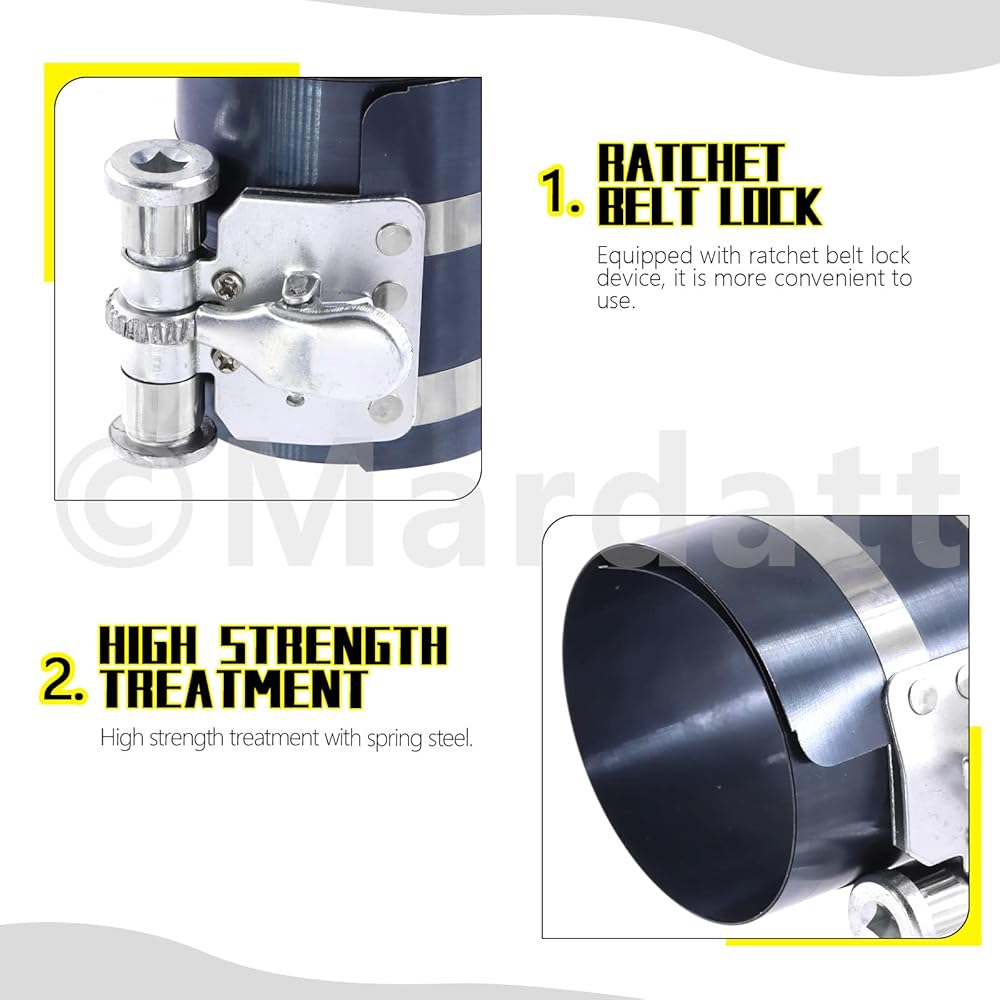 • 【Installation without Damage】 Perfect fit on the piston and a positive locking action to compress rings, allows the piston to be installed into the cylinder, so that which prevent damage to the ring or pistons. Simply place the lubricated piston into the cylinder and tighten the compressor, then hammer the piston into the hole with rubber mallet gently while holding downward pressure on compressor.