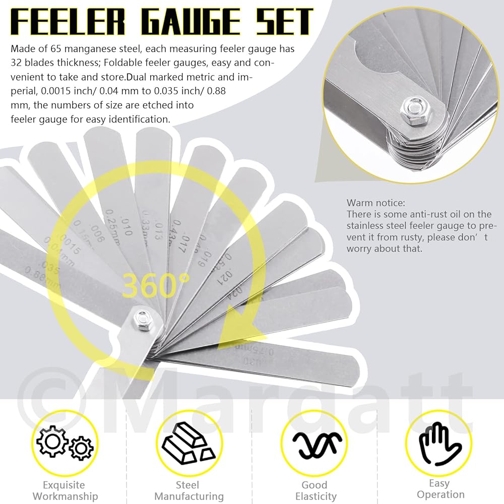 Feeler Gauge (0.04-0.88mm, 32 blades): Metric sizes (mm): 0.04, 0.05, 0.06, 0.08, 0.10, 0.13, 0.15, 0.18, 0.20, 0.23, 0.25, 0.25, 0.28, 0.30, 0.33, 0.35, 0.38, 0.40, 0.43, 0.45, 0.48, 0.50, 0.53, 0.55, 0.58, 0.60, 0.63, 0.65, 0.70, 0.75, 0.80, 0.88