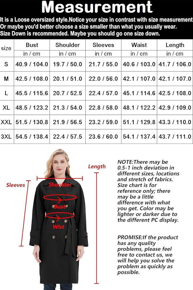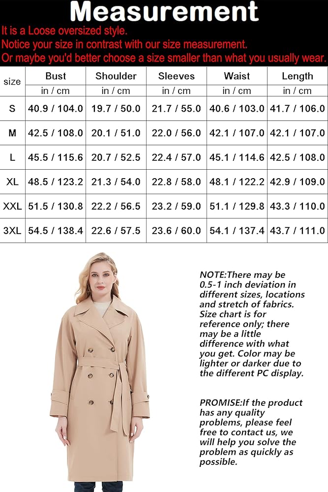 تم تصميم معطف الخندق الطويل للسيدات بأزرار إغلاق مزدوجة الصدر، وياقة طية صدر السترة، وحزام قابل للإزالة، وجيبين جانبيين، وأكمام طويلة، وأساور مع شريط وأزرار قابلة للتعديل، وبطانة بوليستر ناعمة وملساء. تجمع هذه السترة الواقية من الرياح متوسطة الطول بين الطراز الكلاسيكي والمظهر العصري الفريد. إنه أسلوب فضفاض كبير الحجم. لاحظ مقاسك مقارنةً بمقاساتنا في صورة المنتجات السادسة. يوصى بالمقاس السفلي.