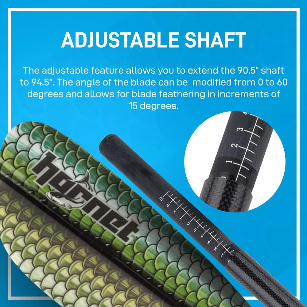 عمود قابل للتعديل: مجذاف الكاياك له عمود مستقيم ويبلغ مقاسه 90.5 بوصة (230 سم). يمكن للآلية القابلة للتعديل تمديد المجداف إلى 94.5 بوصة (240 سم). يمكن تغيير زاوية الشفرة وتعديلها من 0 إلى 60 درجة. يسمح المجداف بتريش الشفرة بزيادات قدرها 15 درجة.