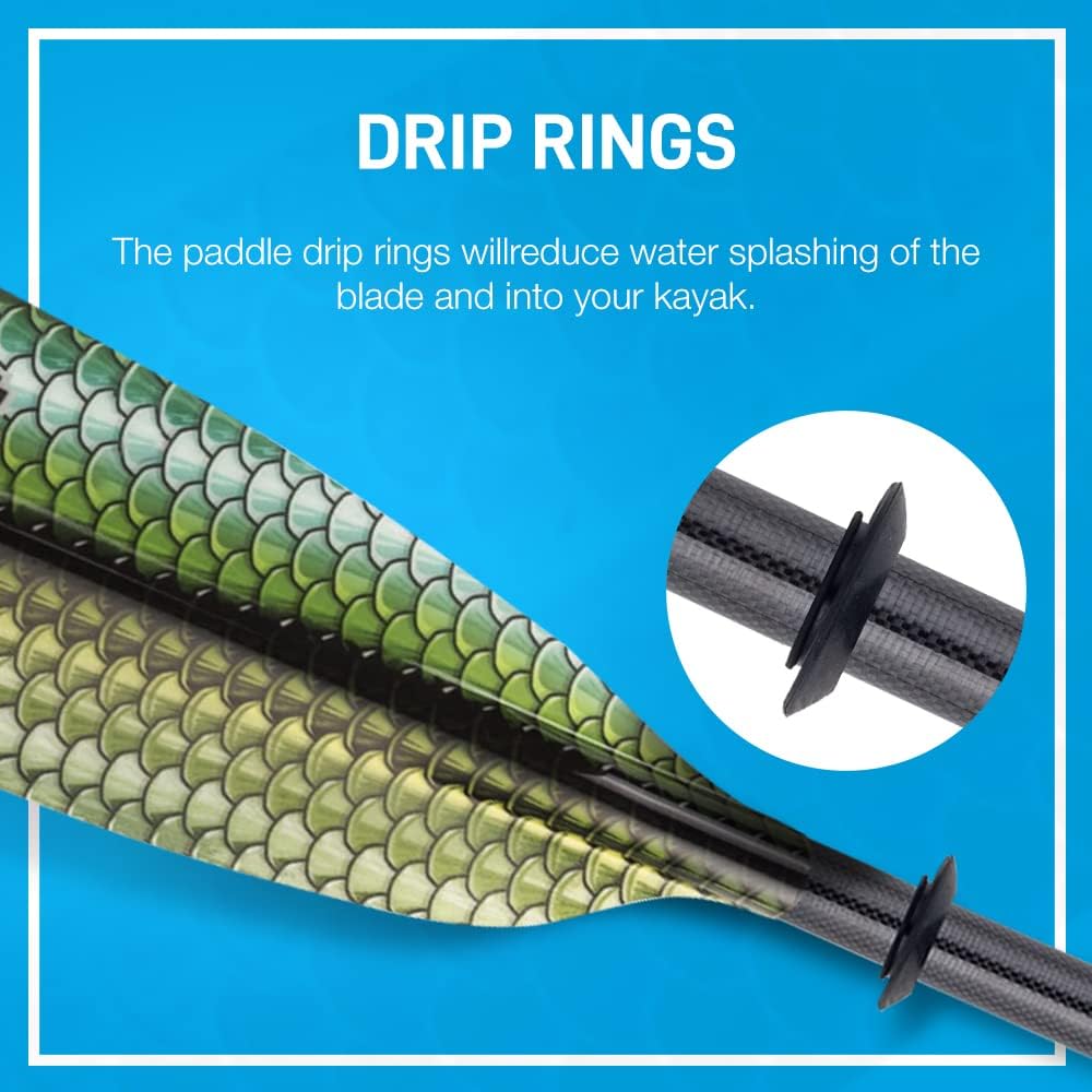 متعددة الوظائف: الشفرة متوسطة الحجم لهذا المجداف مثالية للتجول وصيد قوارب الكاياك وأي نوع من أنواع التجديف الترفيهي. تم تصميم مجاذيف قوارب الكاياك لتناسب التجديف من جميع مستويات المهارة. يناسب معظم مقابض مجداف الكاياك. تتضمن حلقات تنقيط مجداف الكاياك